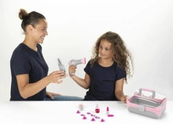 Questa collezione di accessori da parrucchiere dell’azienda Klein è pensata soprattutto per le bambine. Offre un’ampia gamma di prodotti che si completano alla perfezione. Attraverso il gioco, i bambini possono imitare situazioni del mondo degli adulti. Gli strumenti per lo styling come phon e piastra imitano il funzionamento dei dispositivi reali e sono realizzati con grande cura, così che le bambine possano creare acconciature non solo per le loro bambole, ma anche per mamme o amiche. Il phon soffia aria ma non si riscalda. Pettine, spazzola e mollette hanno estremità arrotondate per un gioco sicuro.