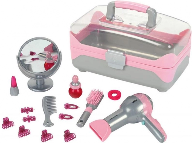 Il set è con licenza del marchio Braun ed è confezionato in una elegante valigetta con coperchio trasparente per una facile sistemazione e ordine. La valigetta è realizzata in plastica di qualità, ha una maniglia ergonomica e una clip che garantisce la chiusura. Tutti gli strumenti corrispondono ai prodotti reali Braun FuturPro Ion-Care e il phon è dotato di un accessorio per lisciare i capelli. È il set perfetto per la piccola parrucchiera esigente e professionale.