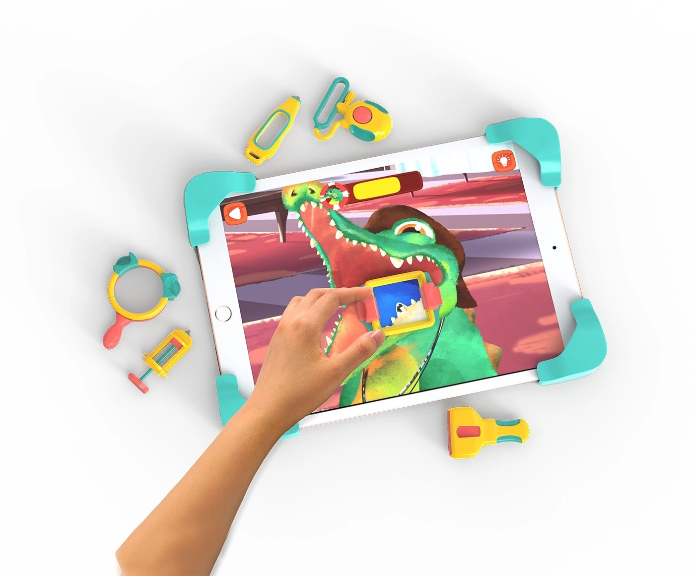 Colorati strumenti in plastica collaborano con l’app e trasformano il tablet in un ambulatorio per bambini. I piccoli posano i pezzi sullo schermo e svolgono i compiti passo dopo passo.