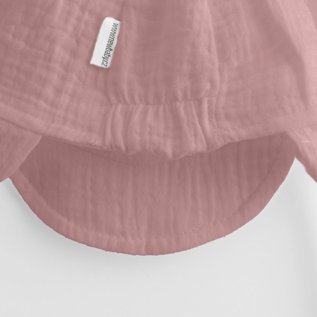 Il cappellino è sagomato sulle orecchie e, grazie alla chiusura con laccetti, rimane ben saldo sulla testa senza fastidiosi punti di pressione. La mussola è un materiale naturalmente resistente, che tollera lavaggi frequenti e con il tempo diventa ancora più morbida. Il delicato colore rosa si abbina facilmente ai look estivi e valorizza l’aspetto tenero del bebè.