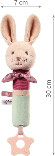 Cercate un compagno morbidissimo per gioco e coccole? Il coniglietto squeak Karo unisce la stimolazione sonora alla scoperta tattile grazie alle orecchie lunghe, alle etichette e al nodino. Alla pressione emette un lieve squittio e insegna al bambino la relazione causa–effetto. Le tonalità colorate ma rilassanti invogliano all’osservazione e alla concentrazione.