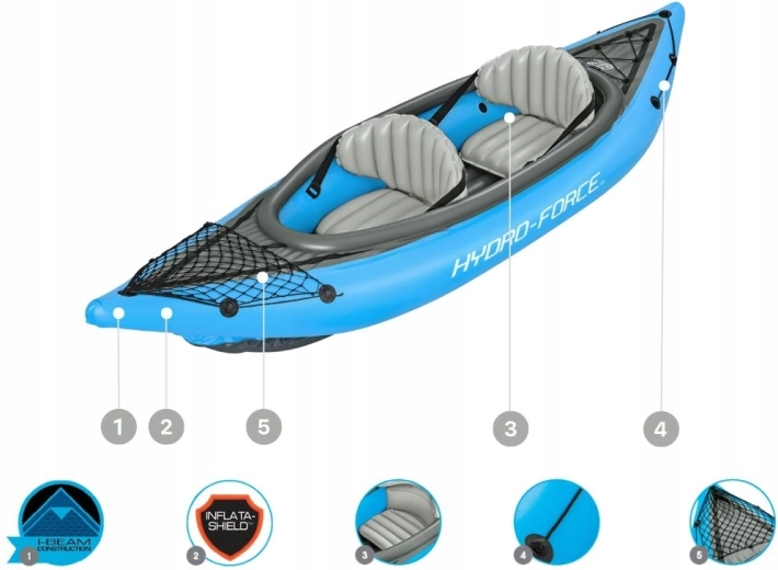 - Set completo pronto all’acqua: kayak, 2 pagaie, pompa, pinna, toppa di riparazione, borsa