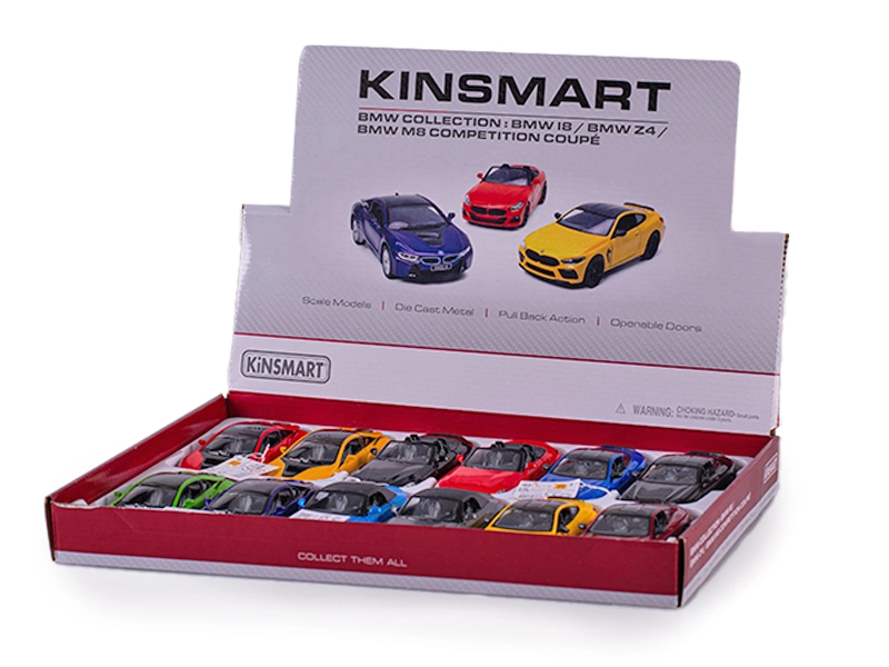Scopri i realistici modelli d'auto in metallo Kinsmart in scala 1:38, ispirati alle BMW i8, Z4 e M8. Ogni modello è realizzato in lega metallica di alta qualità con dettagli in plastica, dispone di porte apribili e di retrocarica (pull-back) per un divertente movimento. Lunghezza 13 cm e quattro varianti di colore per bambini dai 3 anni e per collezionisti.