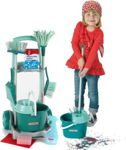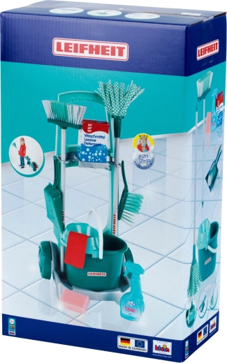 Il set per le pulizie per bambini con licenza ufficiale LEIFHEIT sembra un vero corredo da pulizia, ma è adattato in sicurezza per i piccoli aiutanti. Il robusto carrello con ruote ha supporti per gli attrezzi, un ripiano per il secchio e spazio per la scatolina con il “detergente”, così i bambini possono sentirsi come durante una vera pulizia.