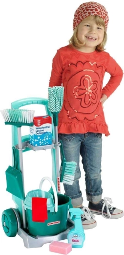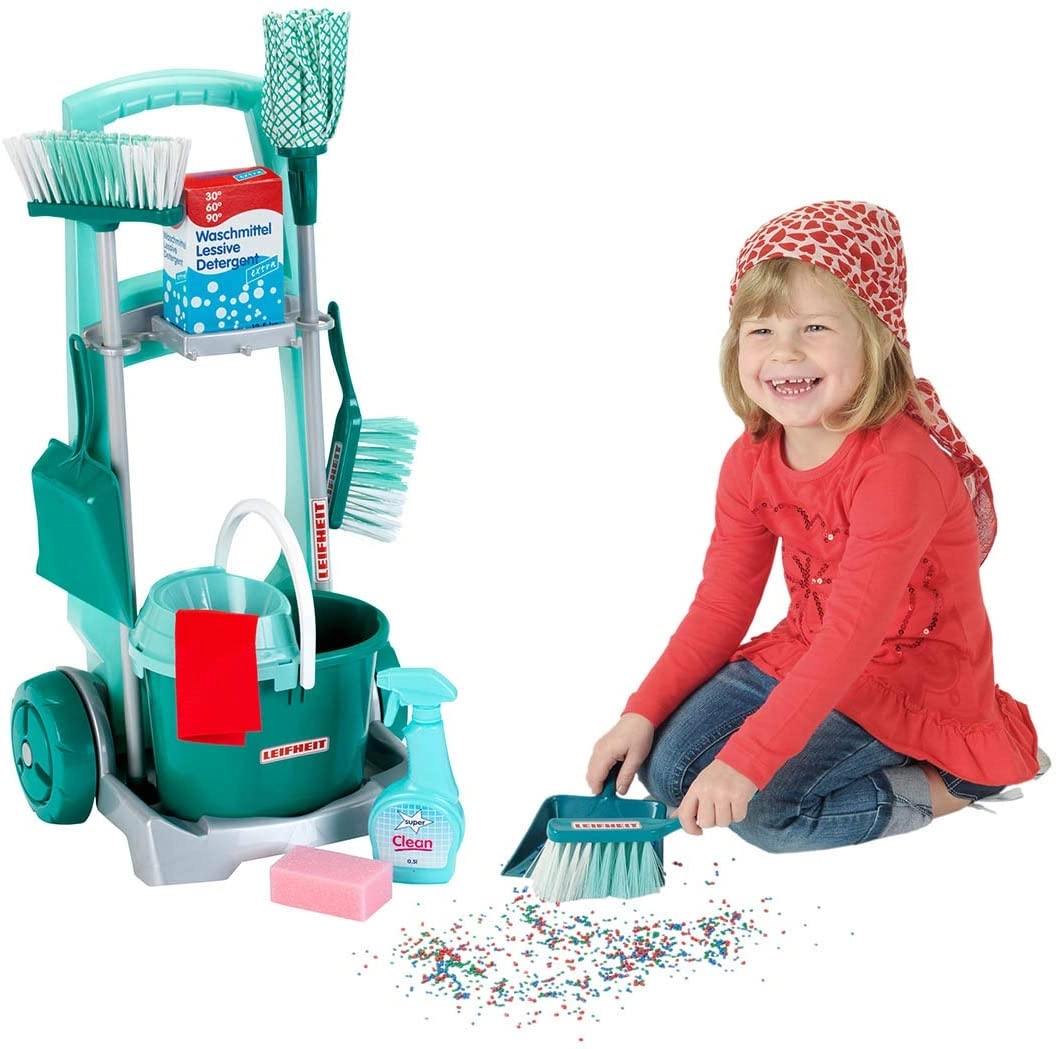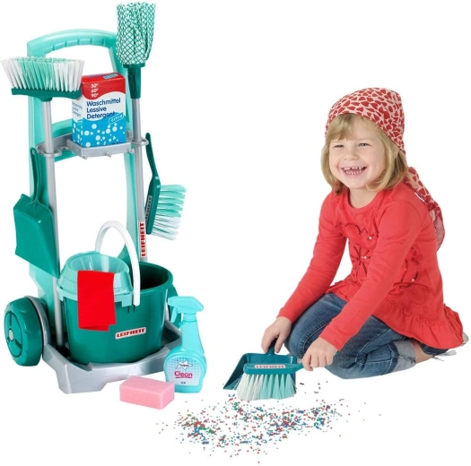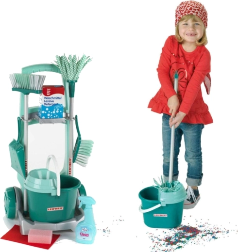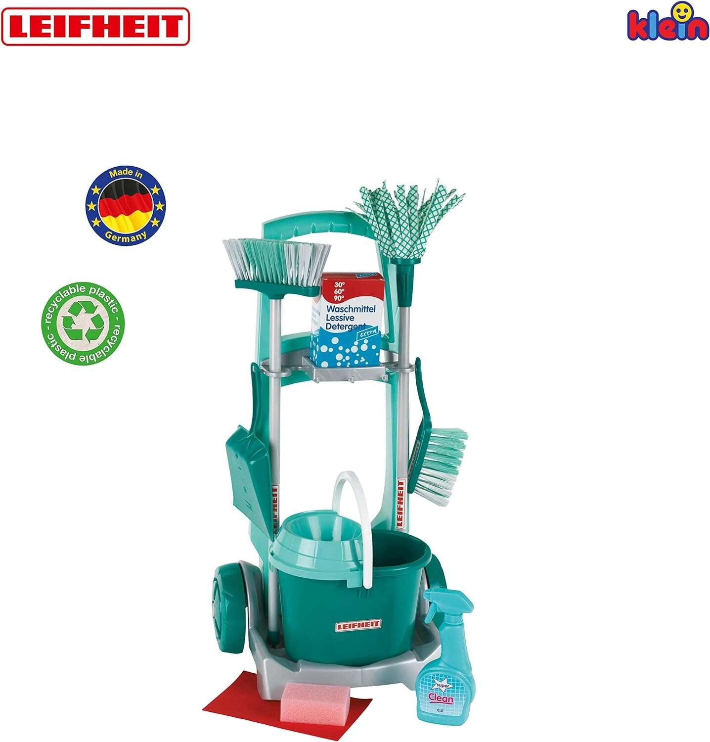 Elegante carrello per le pulizie per bambini con licenza LEIFHEIT del marchio KLEIN, per un gioco realistico della casa. Il set include un carrello con ruote, secchio con strizzatore, mop, scopa, paletta con spazzolino e altri accessori per imitare le vere pulizie. Grazie ai materiali leggeri e ai supporti studiati, tutto è facile da maneggiare e pronto per giocare. Ottimo per sviluppare la motricità, imparare la responsabilità e ruoli creativi dai 3 anni.