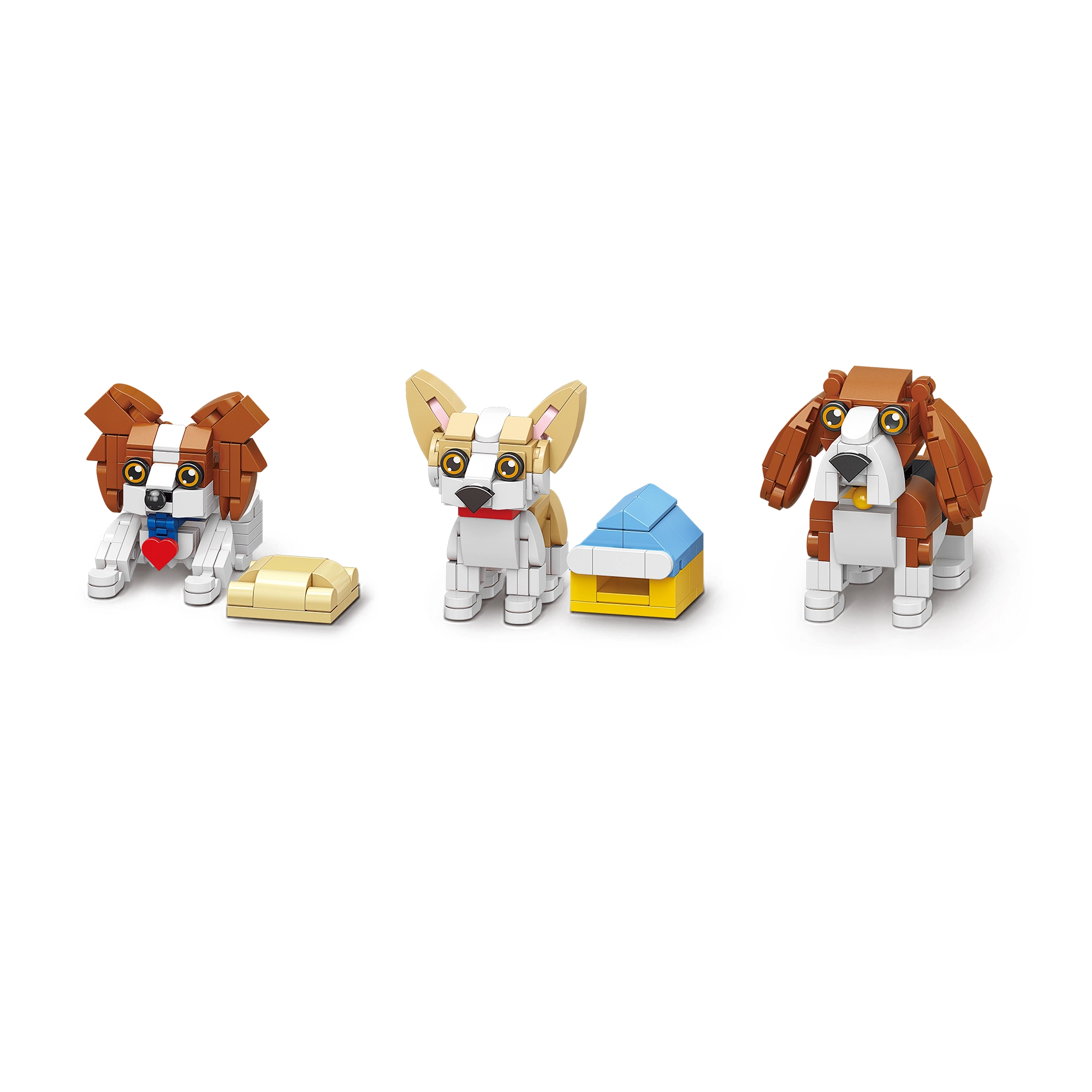 Assembla cagnolini diversi – dai corgi ai teneri amici bianco-marroni con accessori. Ogni modello ha un proprio carattere e dettagli che piaceranno a piccoli costruttori e collezionisti.