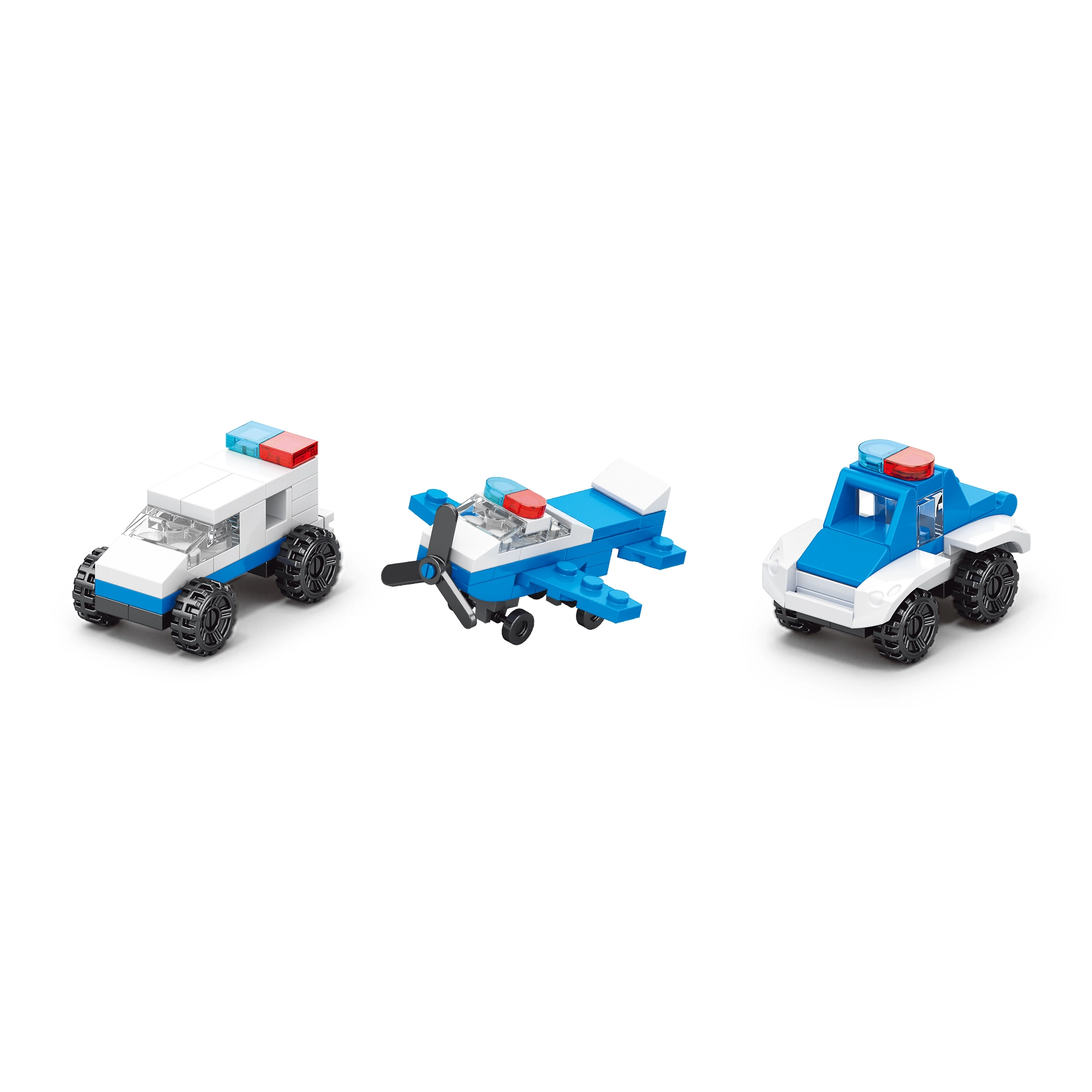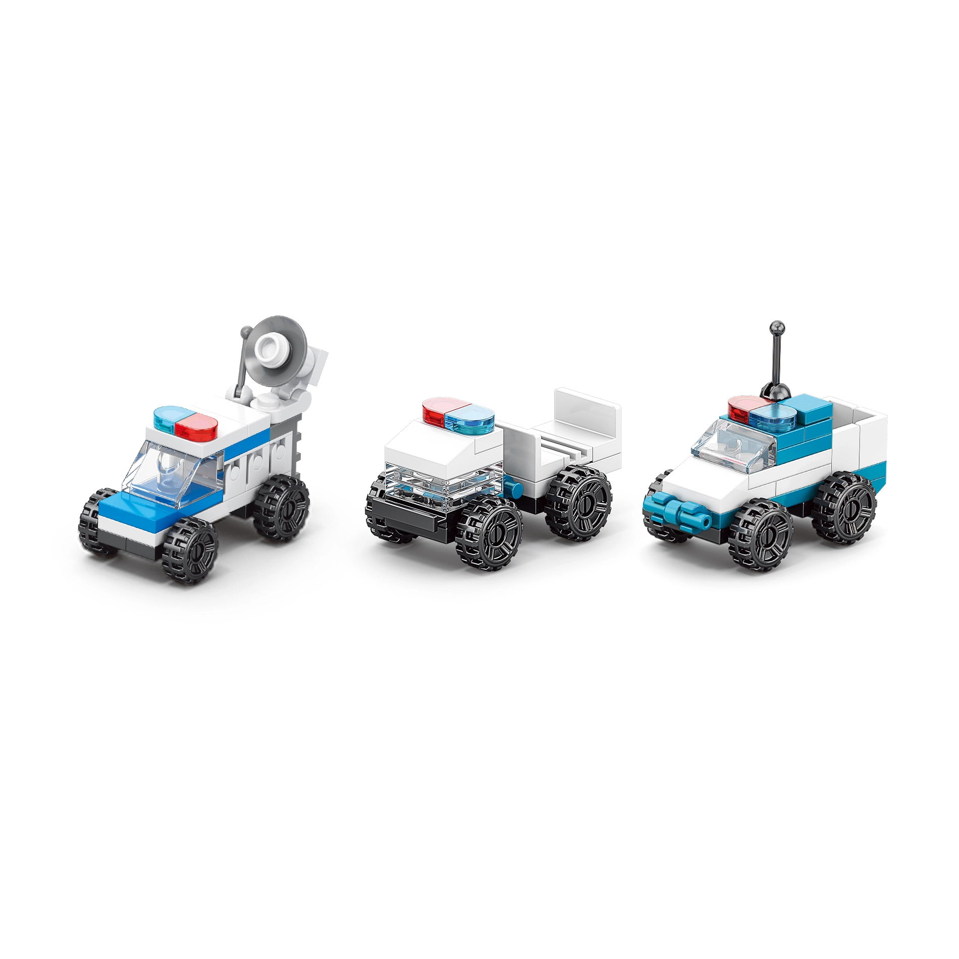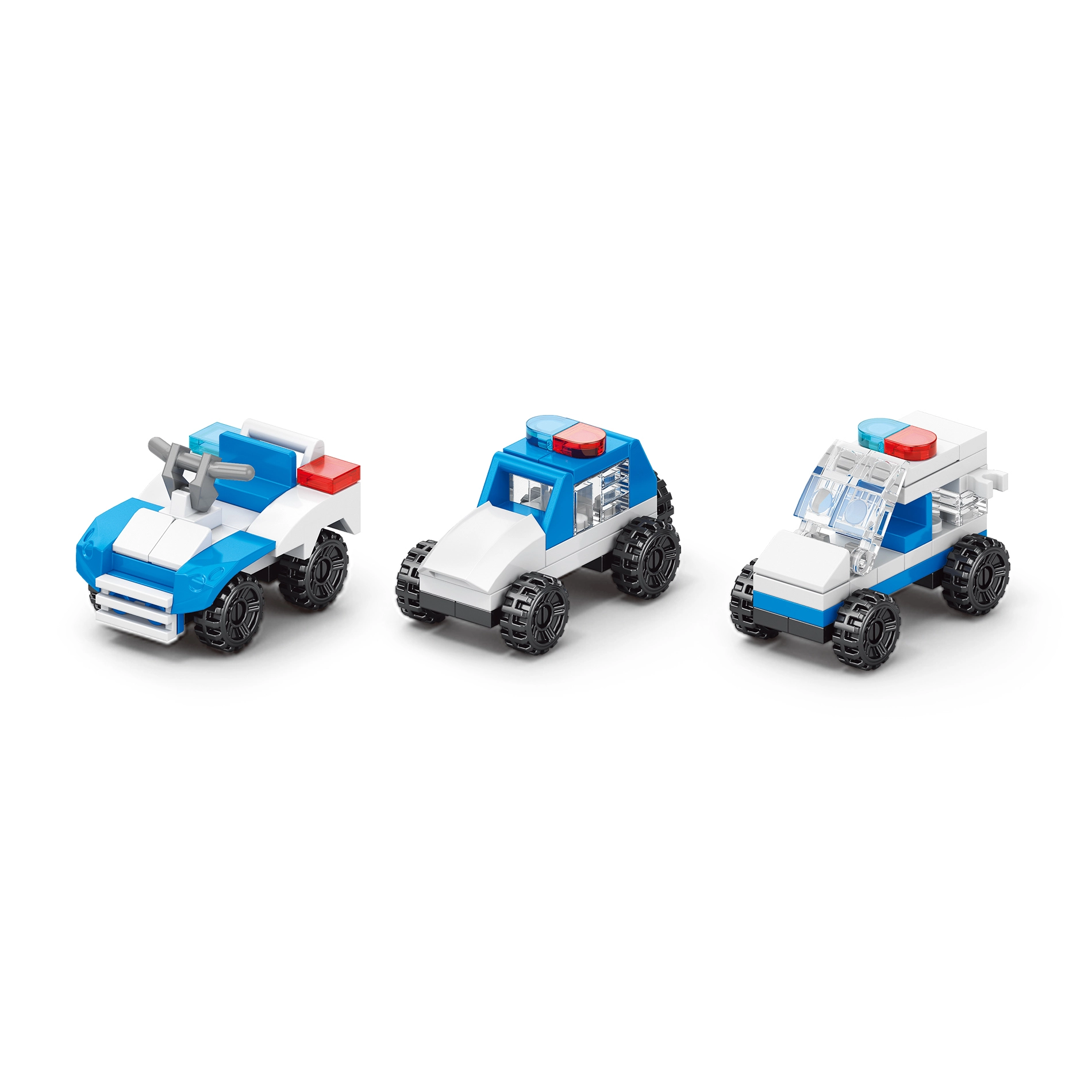 Il set include elementi nella colorazione blu‑bianca della polizia, con finestre trasparenti e luci che conferiscono ai modelli un aspetto autentico. Il set è compatibile con la maggior parte dei principali set di costruzione, così potrai ampliarlo facilmente con altri kit e creare il tuo mondo cittadino.