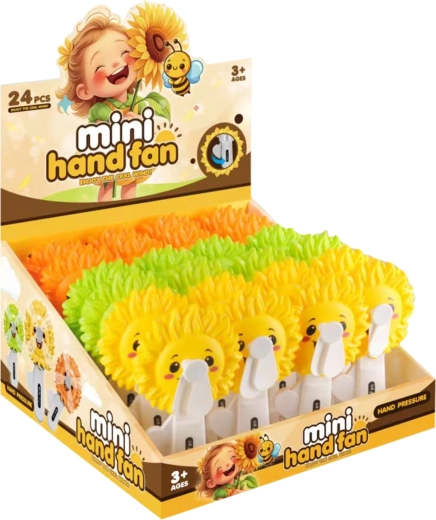 Ventilatore manuale divertente e pratico a forma di girasole per un rapido rinfresco nelle giornate calde. Azionamento meccanico a volano senza batterie, elica in plastica sicura e comando semplice con la pressione della leva: ideale per bambini e adulti in viaggio, in gita o al mare.