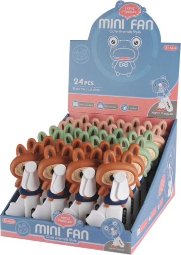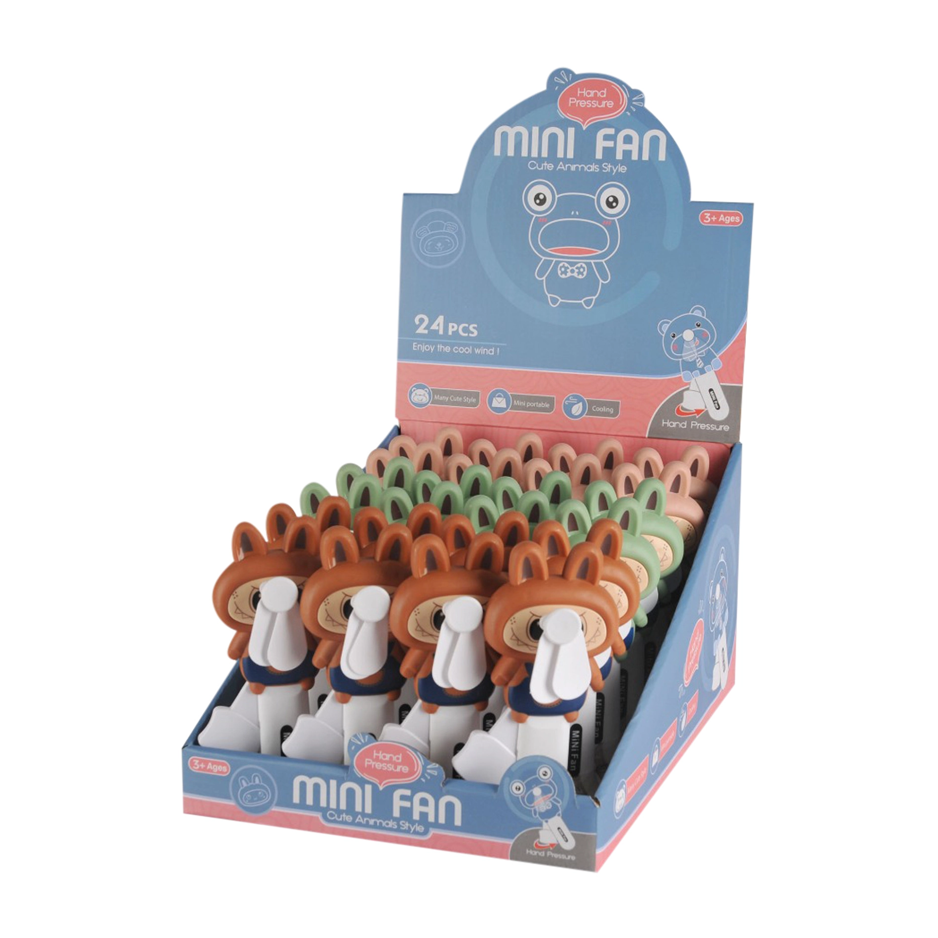 Divertente ventilatore manuale in plastica a forma di coniglio, che si aziona premendo la leva. Raffrescamento semplice per bambini e adulti senza batterie, ideale per le calde giornate estive e in viaggio grazie al meccanismo meccanico con volano.