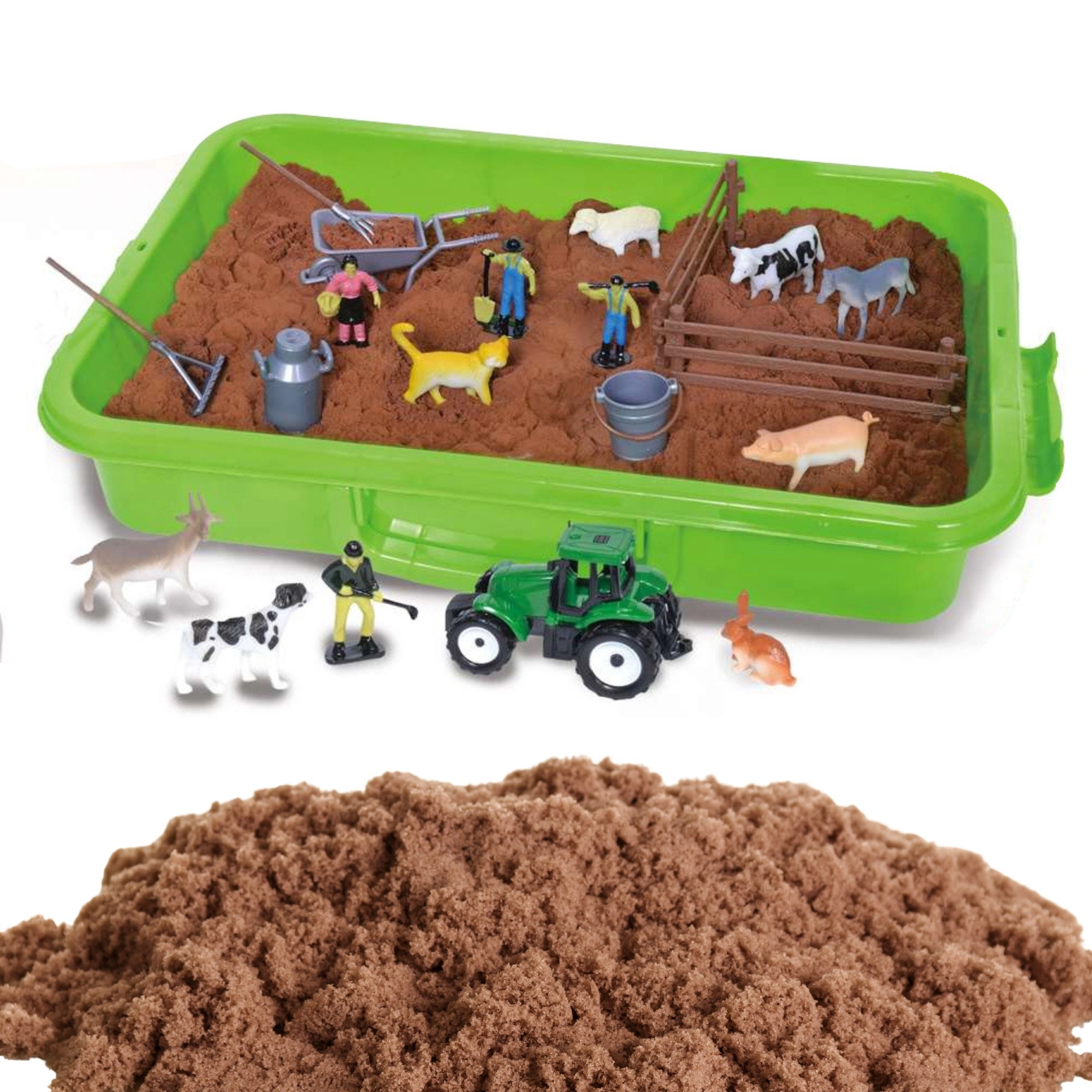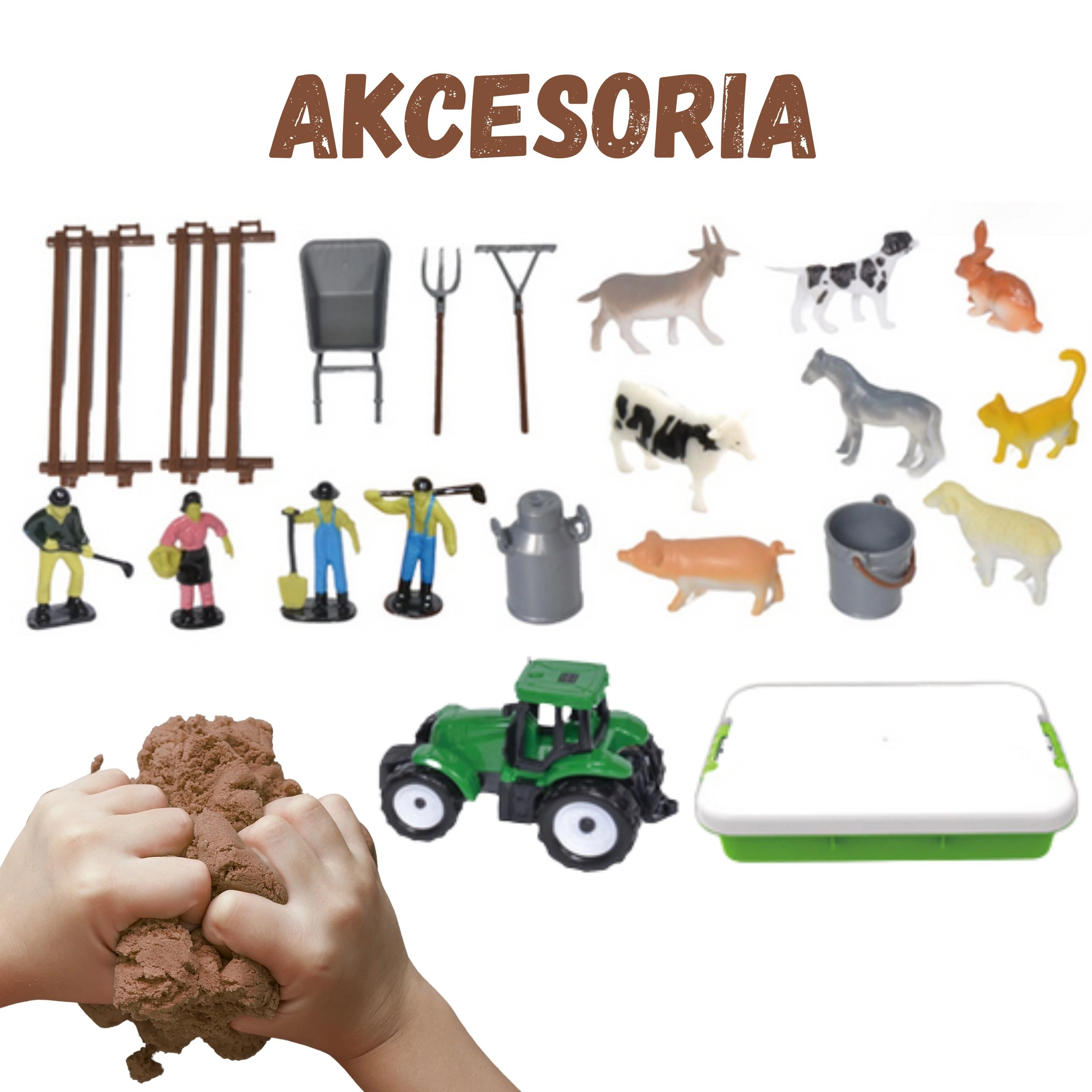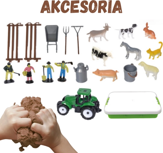- Valigetta/vaschetta, sabbia cinetica 1500 g, trattore verde, 4 figurine di contadini, figurine di animali (cavallo, mucca, pecora, maialino, capra, cane, gatto, coniglio), 2 pezzi di recinzione, carriola, forcone, rastrello, annaffiatoio/latta del latte, secchio, 6 sacchetti con zip