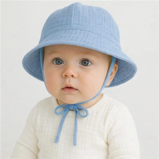 Adorabile e pratico cappellino in mussola New Baby per neonati da 0 a 3 mesi, offre una protezione affidabile dal sole, è leggerissimo, traspirante e grazie ai laccetti da annodare rimane ben fermo sulla testolina. Realizzato in morbida mussola 100% cotone con certificazione OEKO-TEX STANDARD 100.