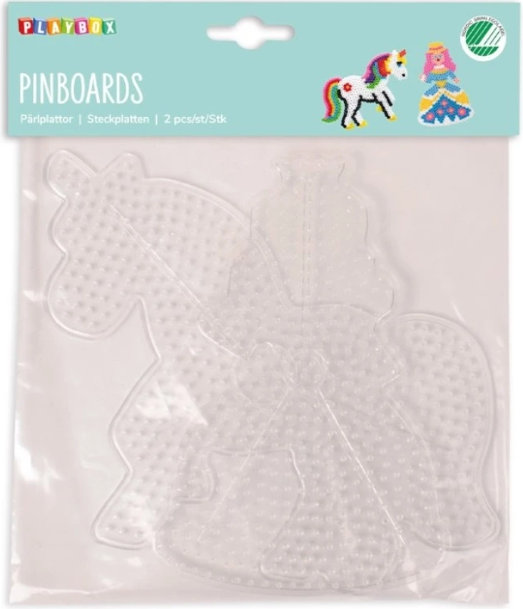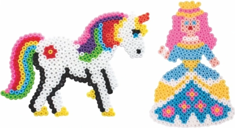 Basi trasparenti PLAYBOX a forma di unicorno e principessa, ideali per perline da stirare Ø 5 mm. Offrono uso semplice con sagome, sono resistenti e riutilizzabili e sviluppano al meglio la motricità fine e la creatività di bambini e adulti.