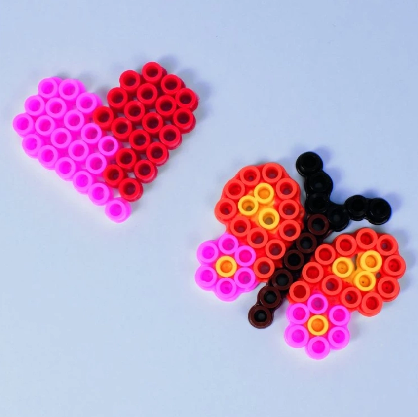Crea motivi variopinti con perline da stirare grandi in modo semplice e chiaro. Le piastre trasparenti PLAYBOX a forma di farfalla e cuore sono ideali sia per principianti che per utenti esperti. Grazie ai pioli disposti in modo chiaro e alla compatibilità con perline Ø 9 mm, comporre i motivi è intuitivo e divertente.