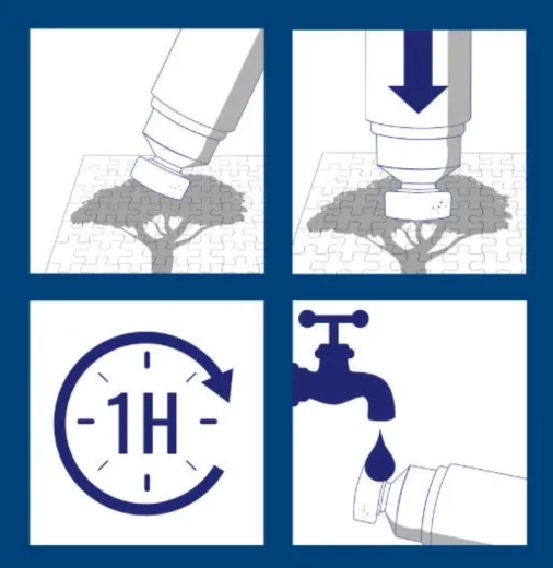Un flacone da 220 ml copre una superficie fino a 1,5 m² – equivalente, ad esempio, a 8 puzzle da 500 pezzi oppure 4 puzzle da 1000 pezzi. L'asciugatura rapida di circa 1 ora consente di incorniciare ed esporre presto il tuo lavoro.
