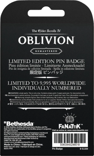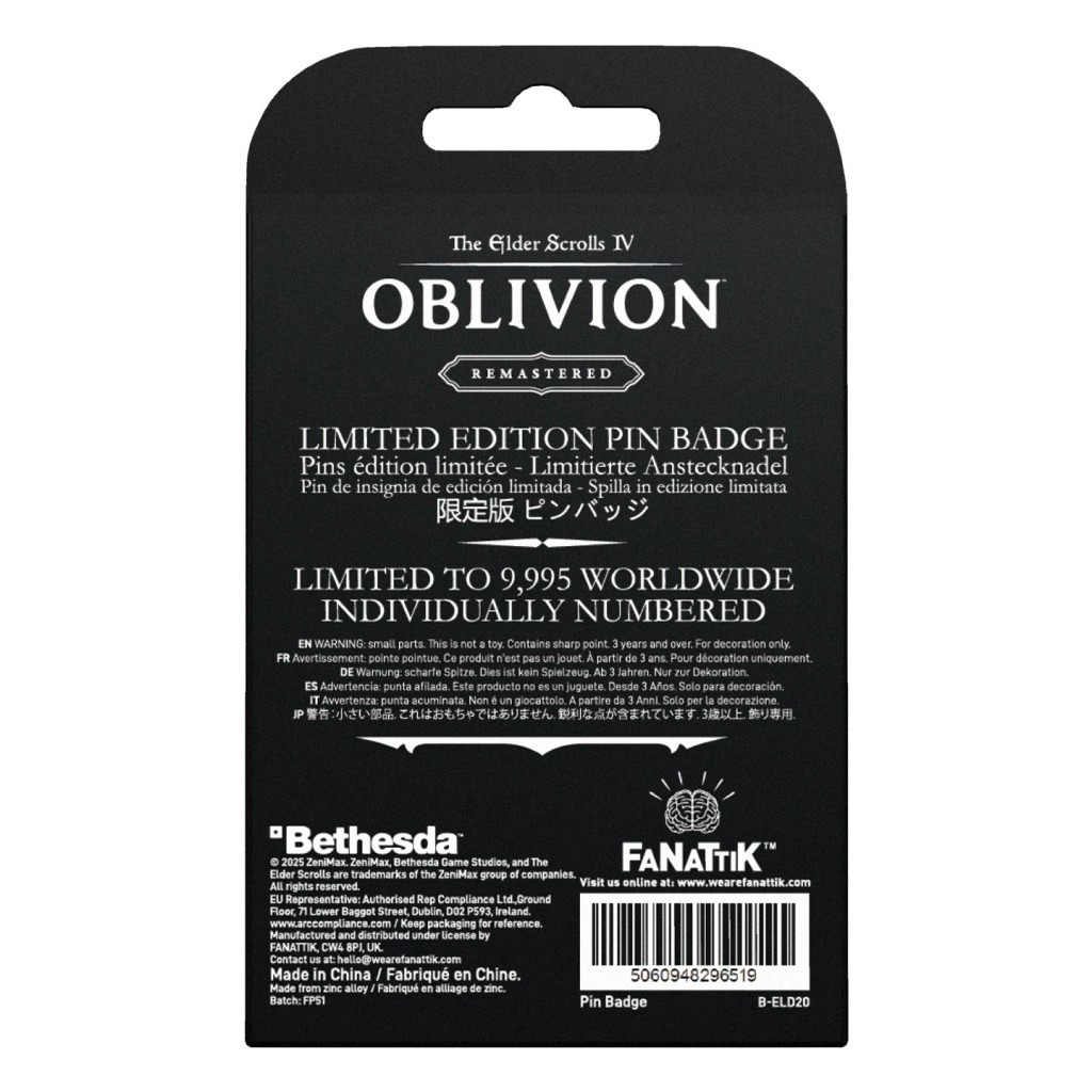 Esprimi la tua passione per il mondo di THE ELDER SCROLLS con una spilla elegante ispirata a Oblivion. La lavorazione in metallo, il contrasto deciso tra nero e argento e il simbolo iconico garantiscono che risalti su zaini, giacche e cappelli.