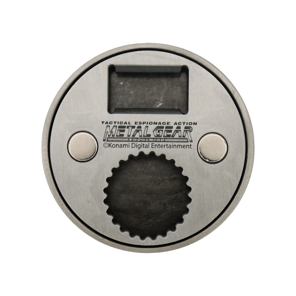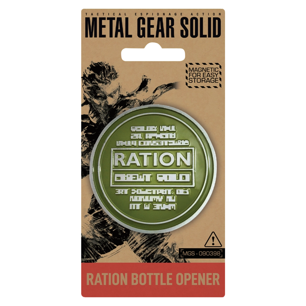 Un elegante apribottiglie ispirato alla serie METAL GEAR SOLID che farà felice ogni fan. Offre una robusta struttura in metallo, dimensioni compatte e una forma ergonomica per aprire le bottiglie con facilità. Il design in stile “ration pack” e la licenza ufficiale lo rendono un pezzo pratico e da collezione.