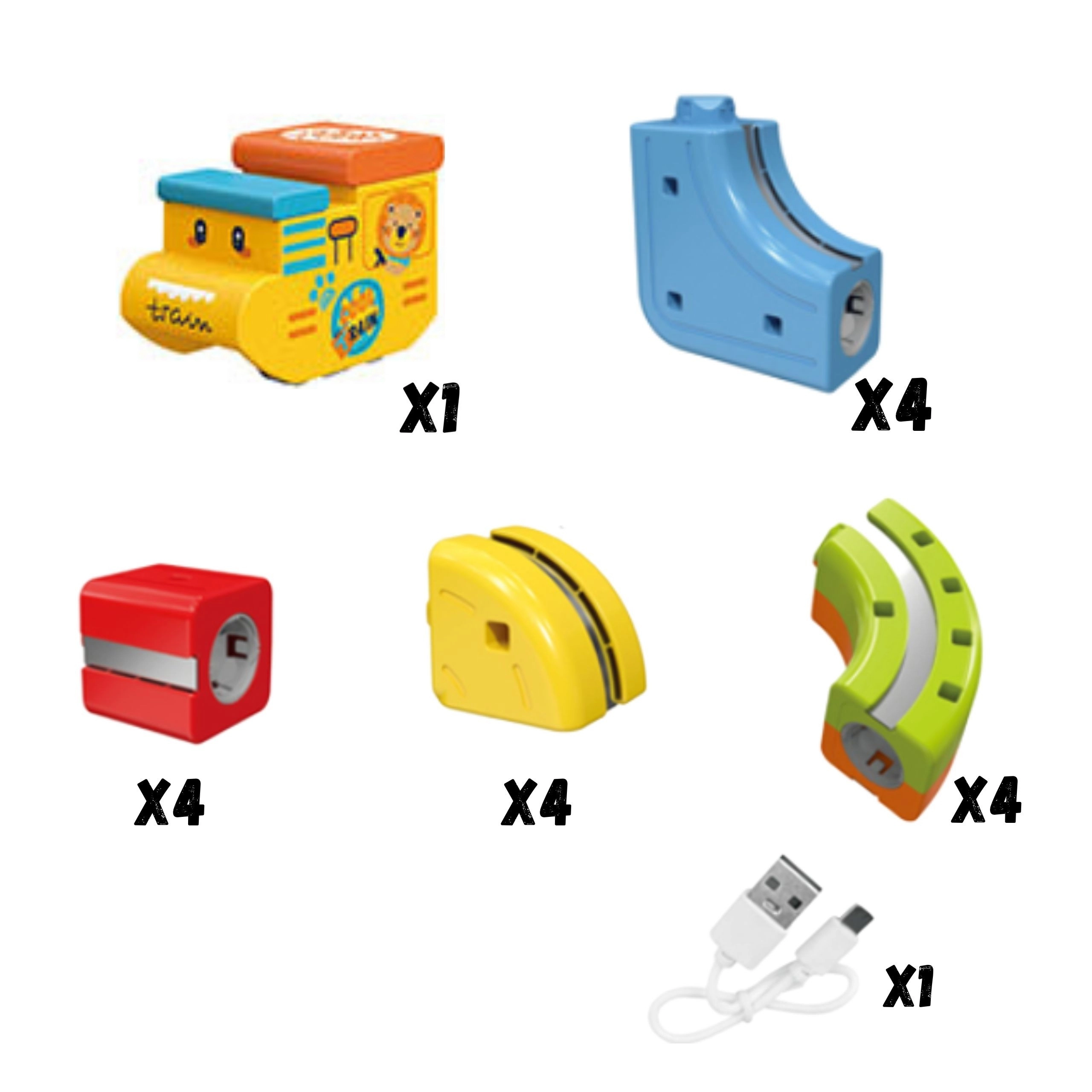 - 1× veicolo elettrico, 4× pezzi di pista blu, 4× mattoncini rossi, 4× pezzi di pista verdi, 4× pezzi di pista gialli, 1× cavo USB