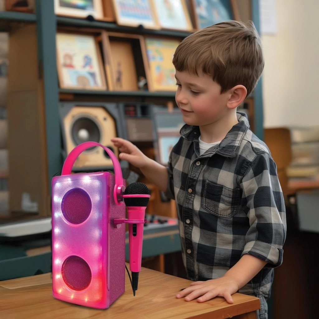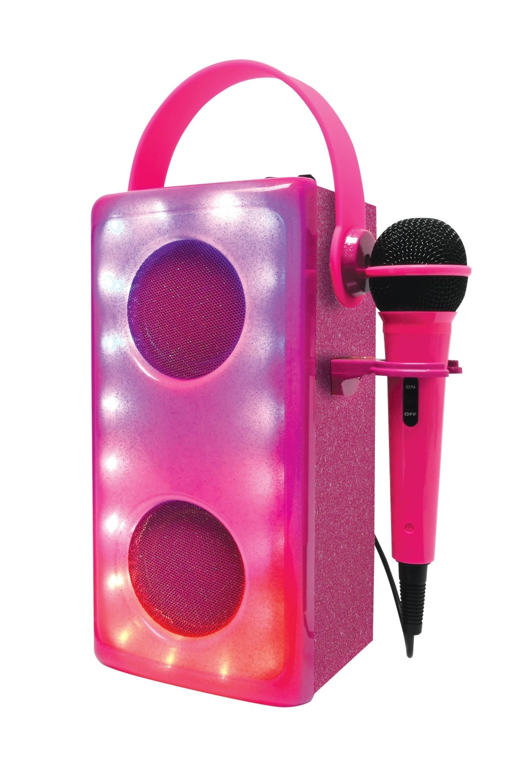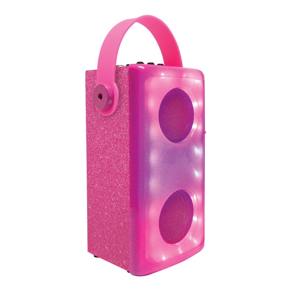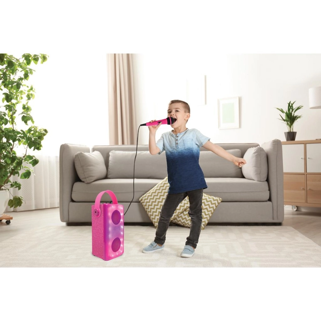 Uno speaker dal design elegante in finitura rosa scintillante trasforma ogni stanza in un mini palcoscenico. Due driver circolari incorniciati da luci LED dinamiche creano una fantastica atmosfera, mentre il microfono incluso con semplice interruttore stimola creatività e fiducia dei piccoli cantanti.