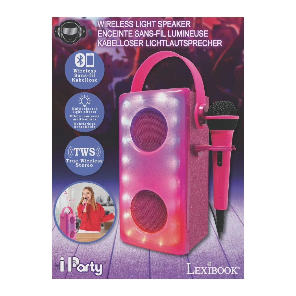 Dai il via a una festa in casa ovunque e in qualsiasi momento con il compatto altoparlante karaoke LEXIBOOK iParty. Offre connessione Bluetooth, microfono cablato rosa nel supporto laterale, effetti LED multicolore sul pannello frontale e comoda maniglia per un facile trasporto. Grazie alla batteria ricaricabile NiMH, bambini e ragazzi si divertiranno per ore, dall’ascolto della musica alle proprie esibizioni canore.