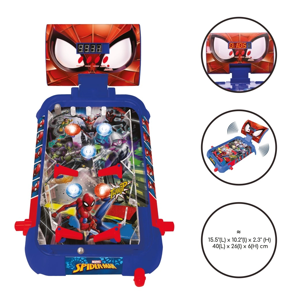 Goditi un flipper ricco d’azione con l’eroe SPIDER-MAN in un pratico formato da tavolo. Scocca blu con comandi rossi, grafica accattivante e chiaro display digitale nello stile degli occhi di Spidey assicurano divertimento per bambini e famiglie. Il coperchio trasparente protegge il piano di gioco e permette di seguire ogni colpo e rimbalzo della pallina.