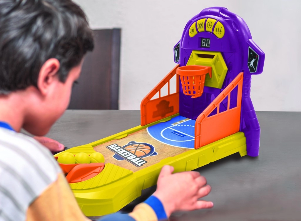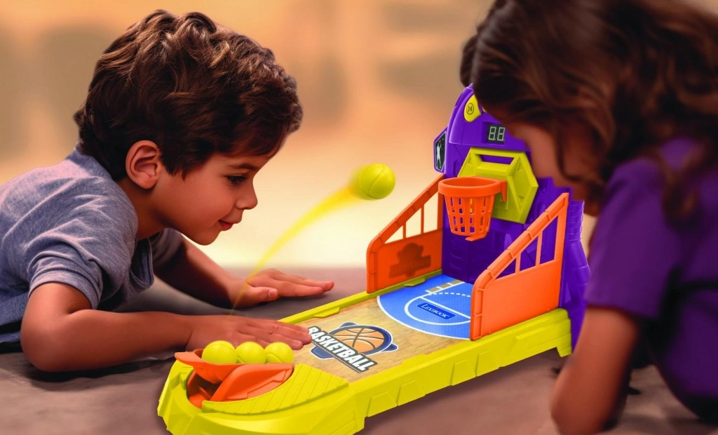 Divertente gioco da tavolo di basket elettronico per bambini dai 4 anni che offre azione veloce, competizione e allenamento della precisione in un formato compatto. Grazie al punteggio elettronico, agli effetti luminosi e sonori e a tre livelli di difficoltà, si divertono sia i principianti sia i più esperti. Il design colorato con sponde di protezione mantiene le palline in gioco e il lanciatore meccanico garantisce tiri facili e divertenti.