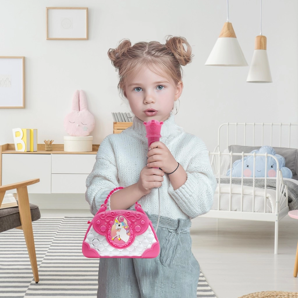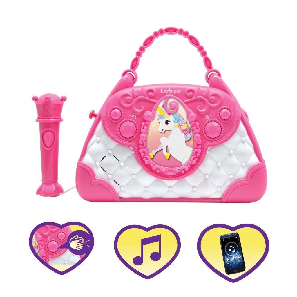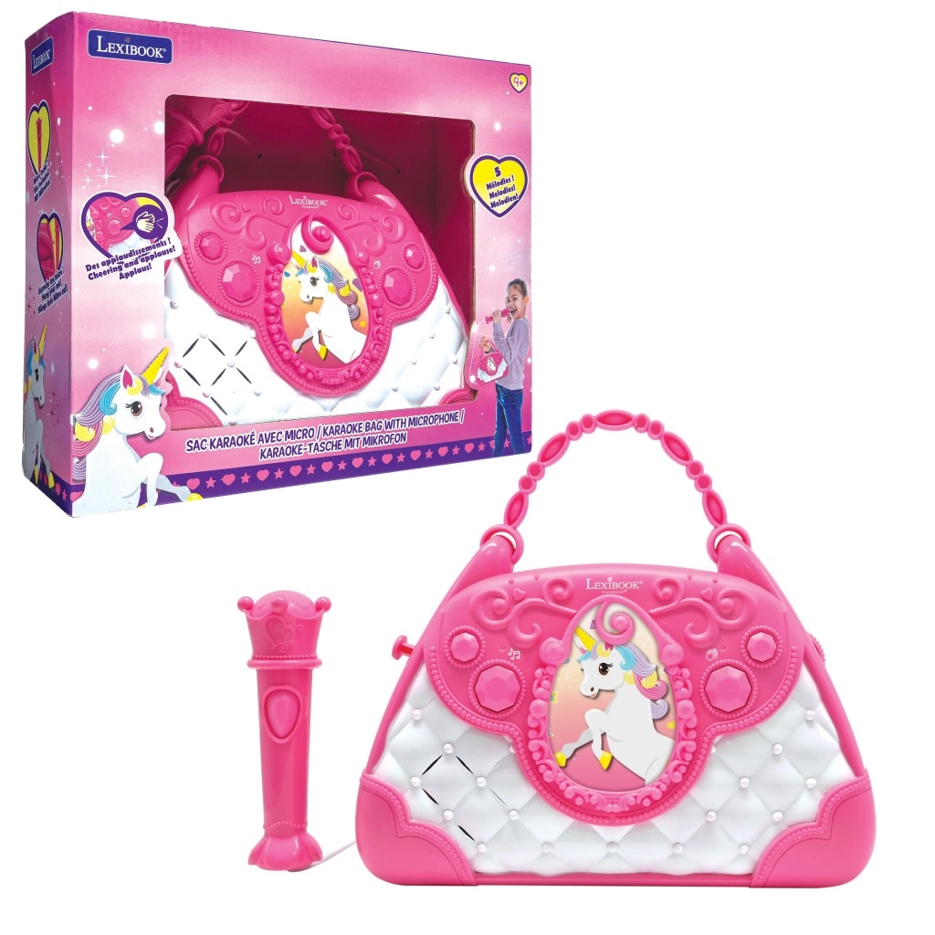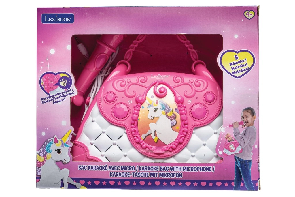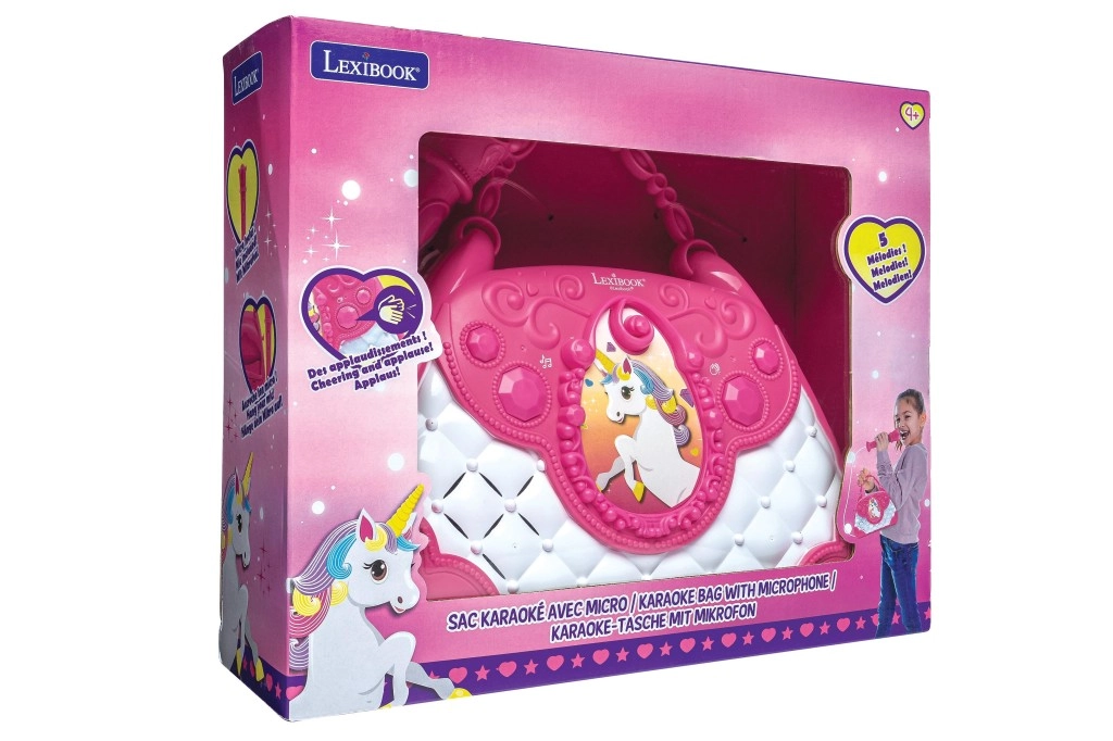 Elegante borsetta rosa e bianca con motivo Unicorno che trasforma ogni giorno in un piccolo palcoscenico. I bambini possono cantare al microfono e ascoltare la propria voce tramite il potente altoparlante integrato. Grazie ai pulsanti intuitivi è facile regolare il volume, scegliere le melodie e attivare l’applauso, che rafforza la loro autostima.