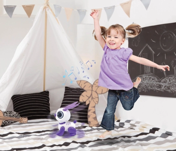 La finitura bianco‑viola con grandi occhi e lunghe orecchie in plastica sicura e facile da pulire è ideale per le piccole mani dei bambini. Il coniglio può muoversi in avanti e indietro ed eseguire allegri movimenti di danza che animano ogni momento di gioco.