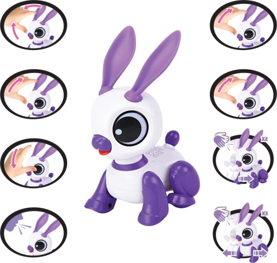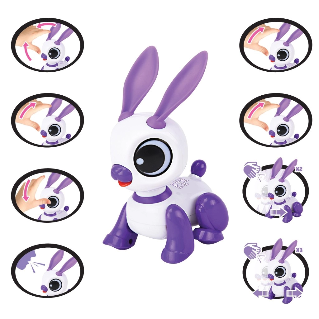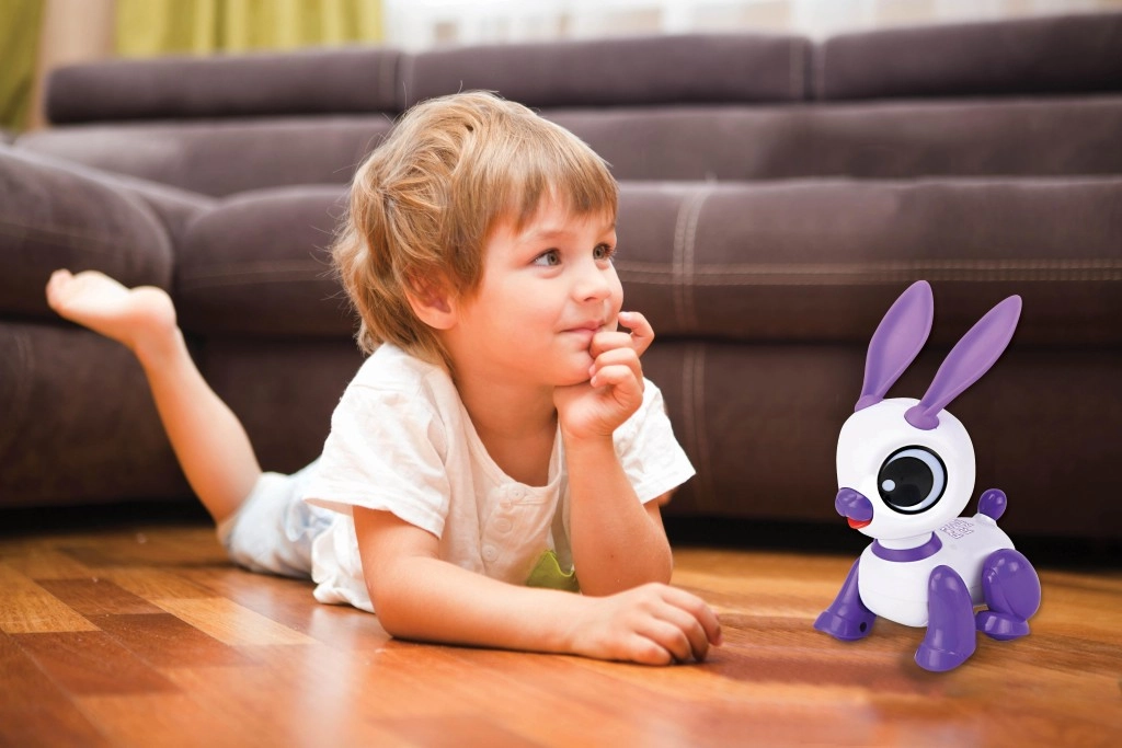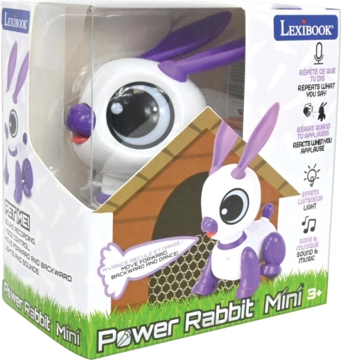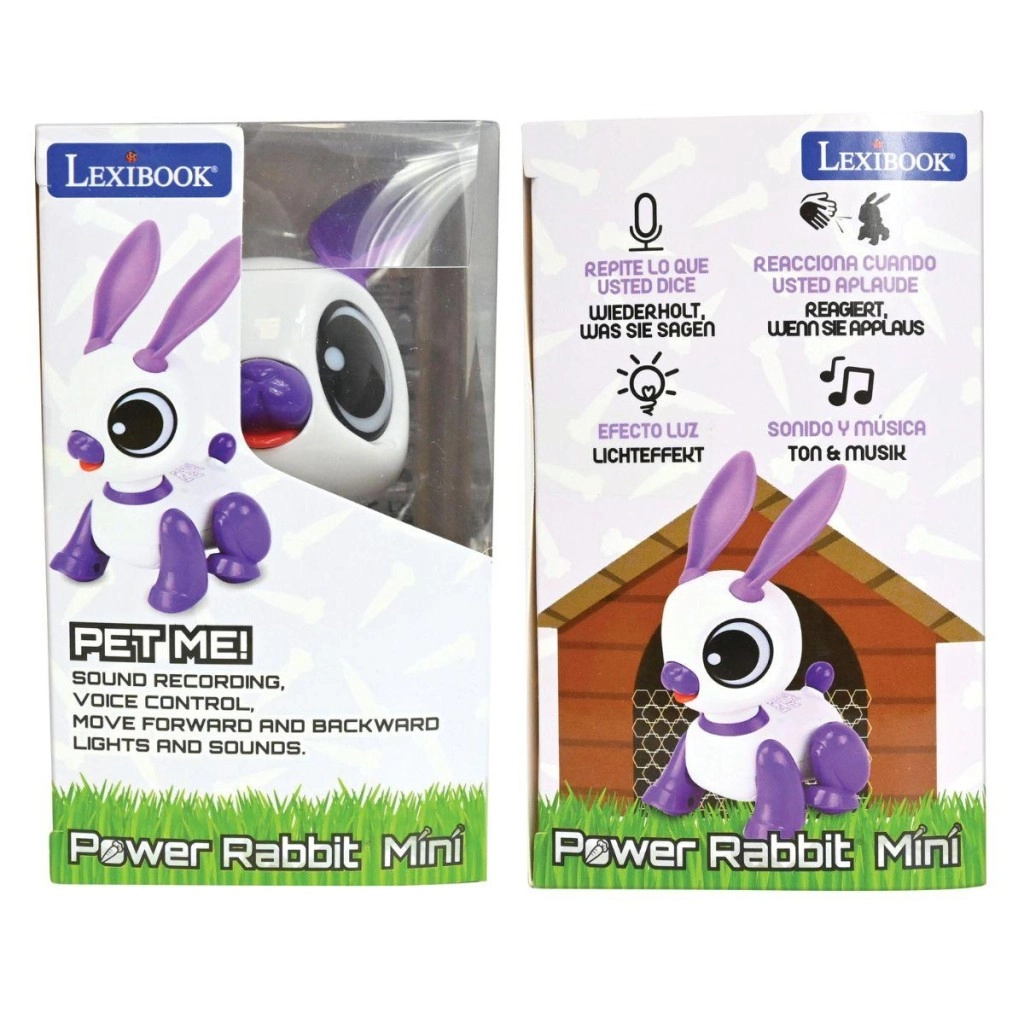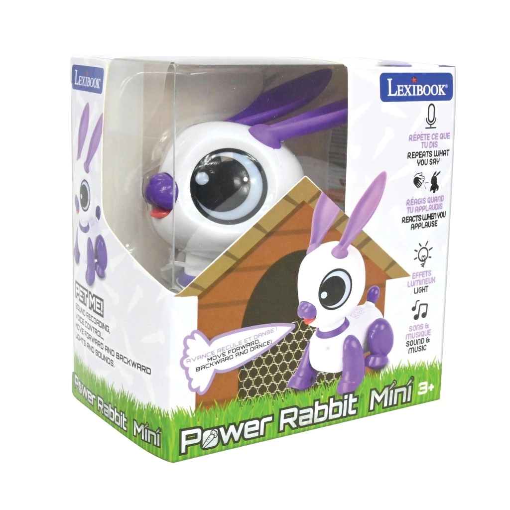 Mini coniglio robotico interattivo LEXIBOOK diverte i bambini dai 3 anni con la ripetizione della voce, la reazione al battito di mani e luci, suoni e musica giocosi. Il design compatto bianco‑viola con grandi occhi e orecchie mobili stimola la creatività, lo sviluppo del linguaggio e le abilità motorie. Il coniglio si muove in avanti e indietro e sa anche ballare – un compagno perfetto a casa e in viaggio.
