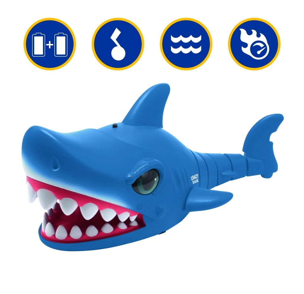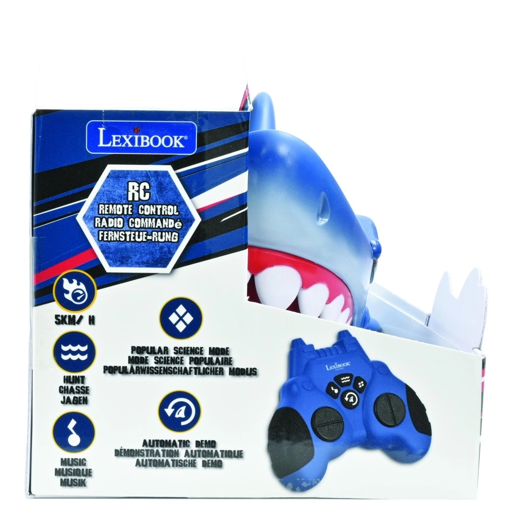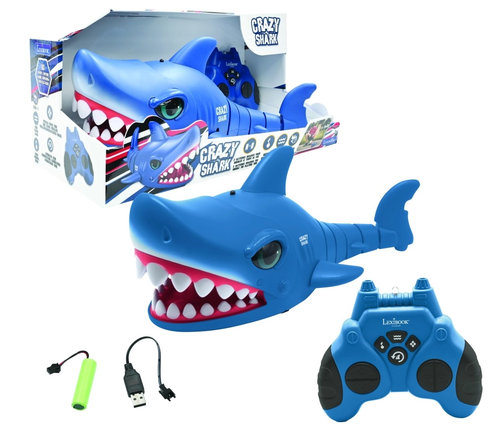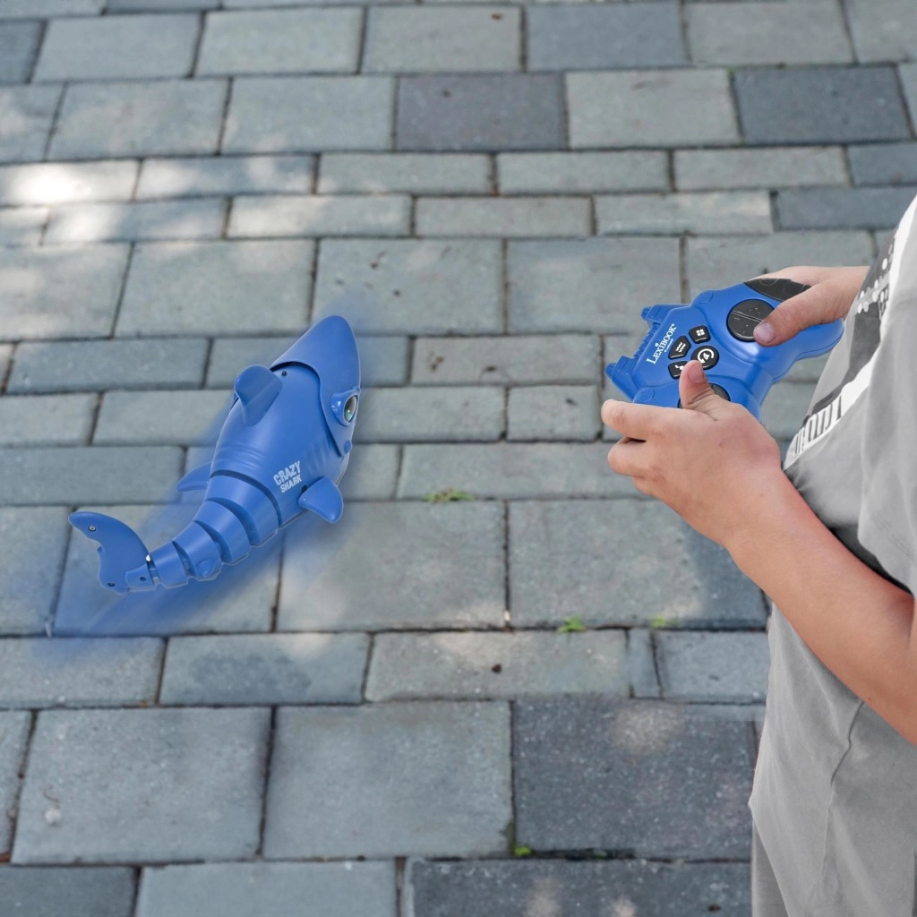 Lo squalo si guida facilmente in tutte le direzioni, raggiunge una velocità fino a 5 km/h e, grazie alla plastica resistente, affronta superfici lisce e marciapiedi. Nella confezione sono incluse 2 batterie ricaricabili NiMH e un cavo USB per una ricarica semplice ed ecologica.
