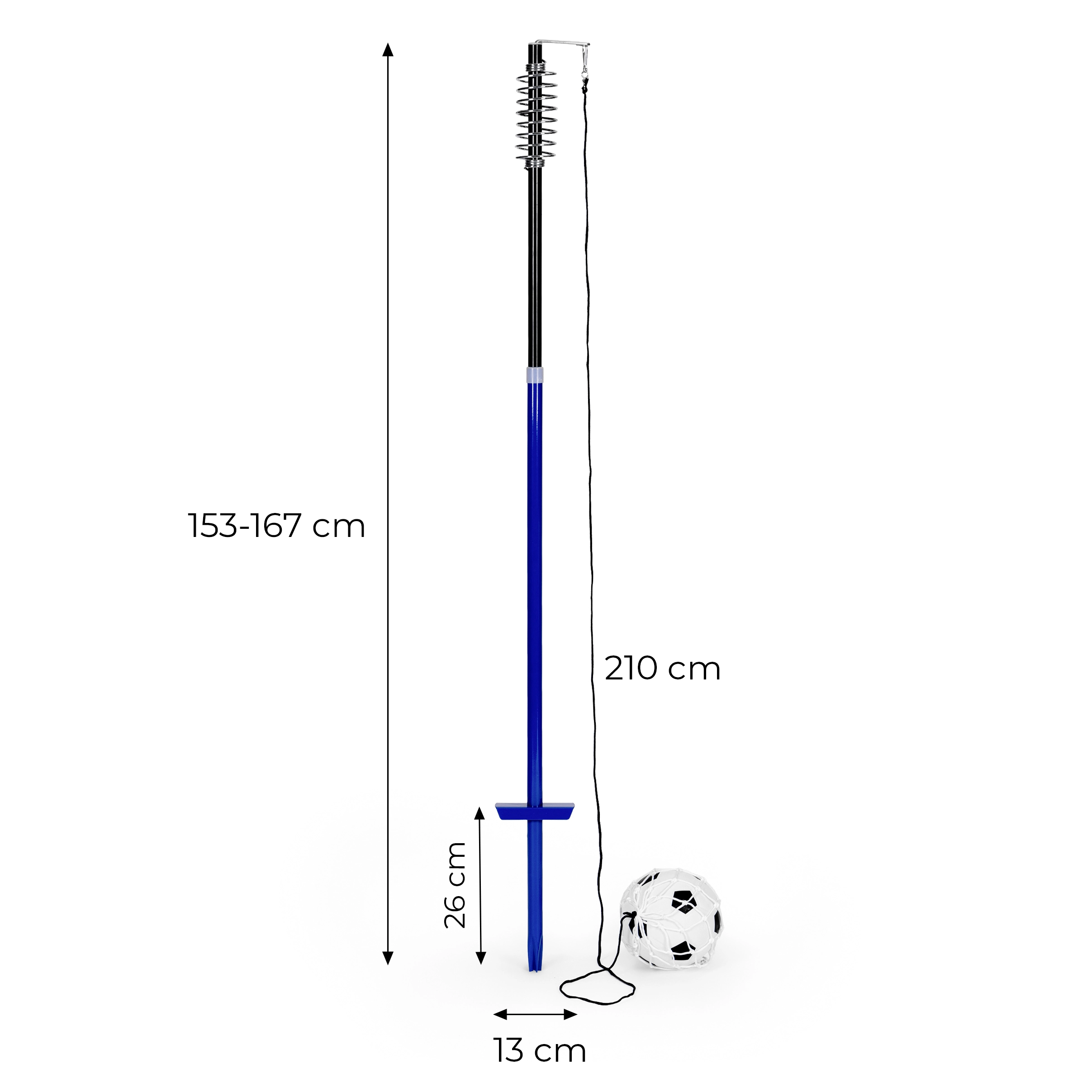 La parte superiore del palo è dotata di una molla che smorza gli urti e rende più fluido il movimento del pallone, aumentando il comfort e favorendo lo sviluppo della tecnica. Tre livelli di altezza (153 / 160 / 167 cm) si adattano alla statura del giocatore e al tipo di esercizio – dal lavoro di base con la palla fino a combinazioni dinamiche e footwork.