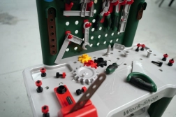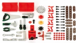 Incluso un ricco set di accessori di qualità: cacciavite a taglio e a croce, chiave, livella, pinze e lima, inoltre martello, sega, squadra, viti, dadi e listelli di costruzione. I bambini allenano in modo giocoso la motricità fine, la coordinazione e il pensiero logico collegando i listelli e avvitando.