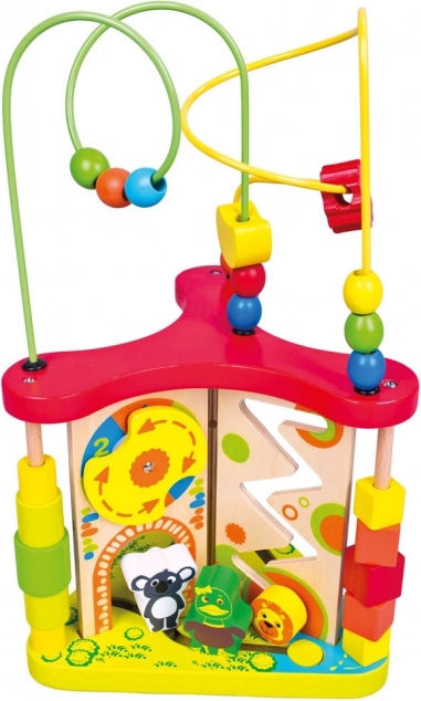 Questo labirinto attività multifunzionale in legno del marchio Bino è progettato per divertire e allo stesso tempo stimolare i bambini. Le perline su fili metallici, gli elementi girevoli e scorrevoli e le illustrazioni di animali incoraggiano curiosità, concentrazione e coordinazione occhio–mano.