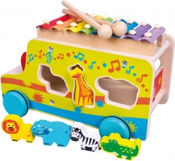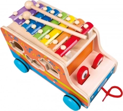 Il giocattolo in legno Bino è il perfetto compagno per ogni bambino. Questo camion serve non solo come giocattolo da traino, ma offre anche un'elemento musicale divertente grazie al xilofono sul tetto con bacchette. Il giocattolo aiuta a sviluppare abilità come il riconoscimento dei colori e delle forme e supporta la coordinazione dei movimenti.
