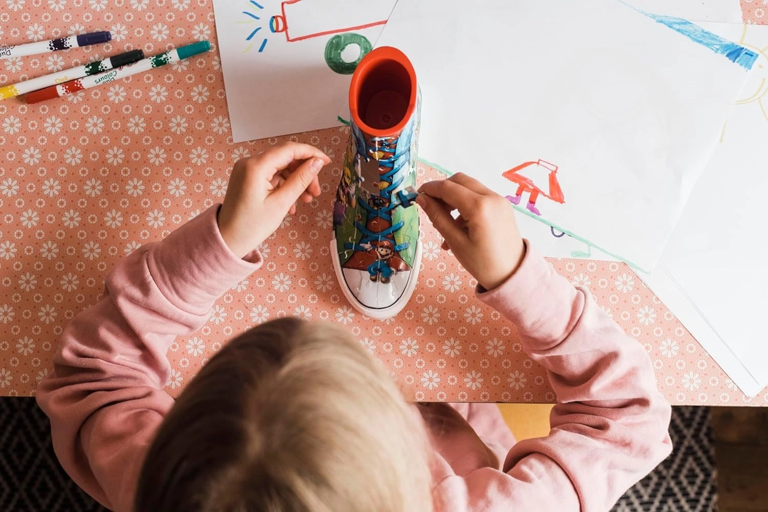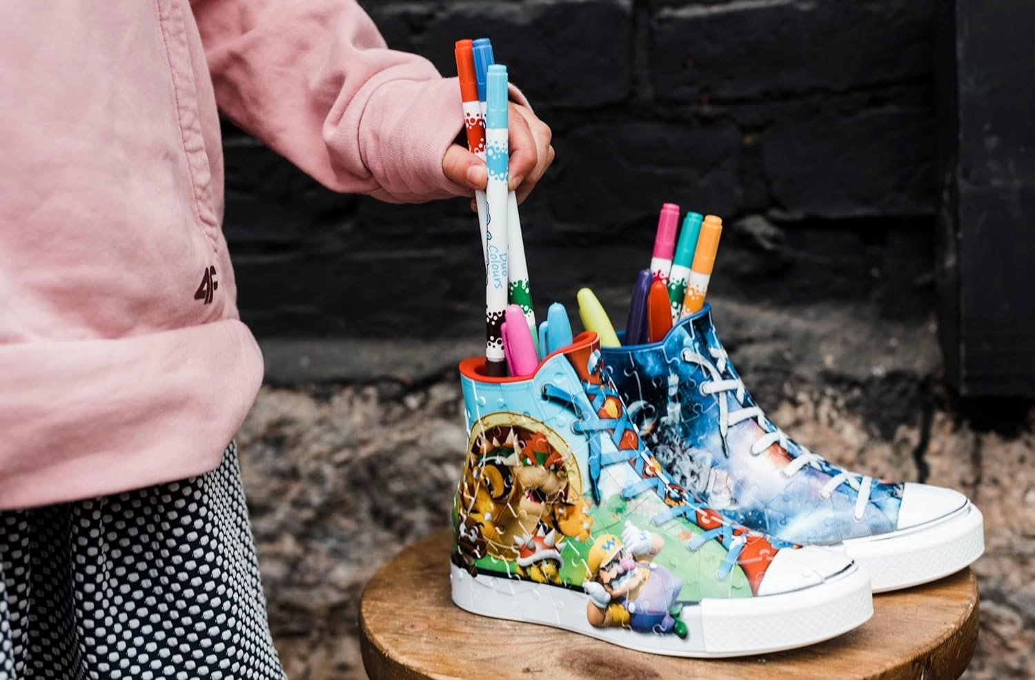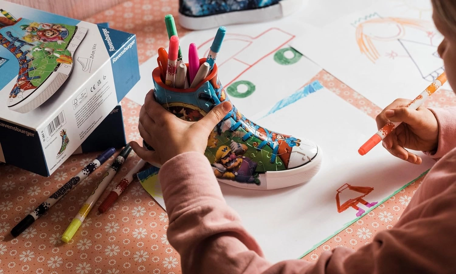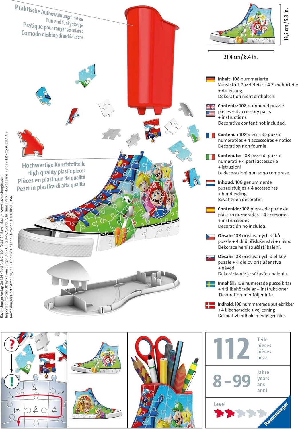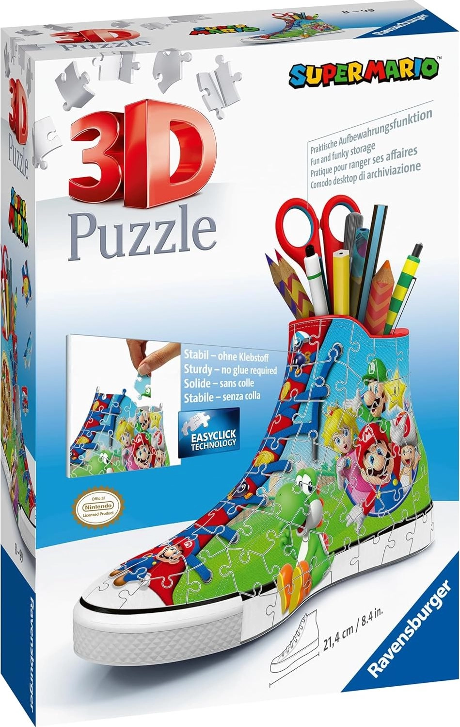 Crea questa classica sneaker con motivi di Super Mario usando 108 pezzi di puzzle in plastica e ottieni una decorazione perfetta per la tua stanza! Una volta completata ti aspetta un bonus extra: puoi usarla per pennelli, matite, ecc.