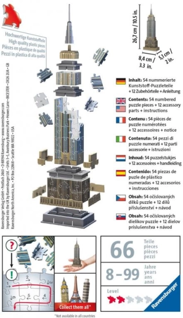 Scopri il fascino dell’iconico simbolo di New York in un formato compatto. Il mini puzzle 3D Empire State Building riproduce fedelmente i dettagli architettonici e, grazie ai pezzi in plastica dimensionalmente stabili, mantiene la forma senza l’uso di colla. L’assemblaggio è intuitivo: puoi seguire il motivo oppure la pratica numerazione dei pezzi.