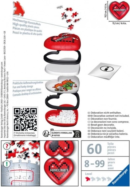 Questo set di puzzle 3D di qualità unisce il mondo amato di Minecraft alla comprovata precisione dei pezzi Ravensburger. Grazie ai solidi pezzi sagomati che non richiedono colla, i bambini possono creare facilmente un modello a forma di cuore stabile, perfetto come decorazione o come regalo per i piccoli costruttori.