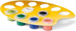 - Tela con schema numerato, colori acrilici, pennello, supporto in cartone per vasetti, cornice