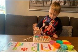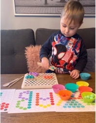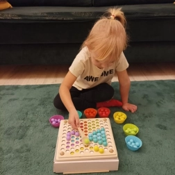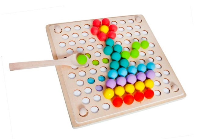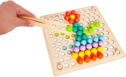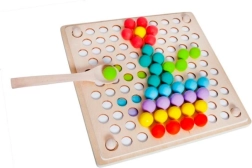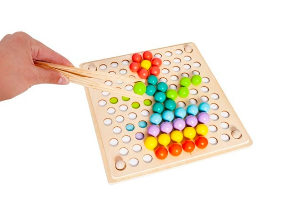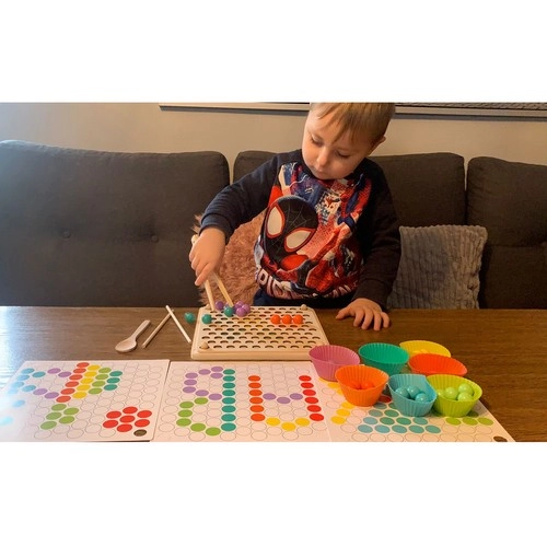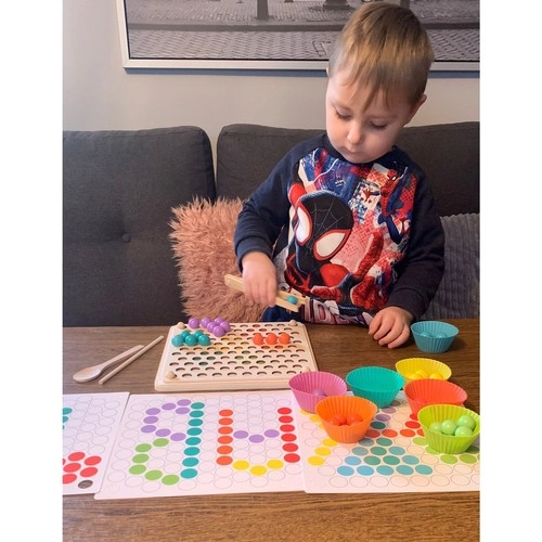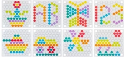 La confezione include: board per inserire le perline, ciotoline per le perline, perline (7 colori), cucchiaio, pinzetta, bastoncini, modelli illustrati