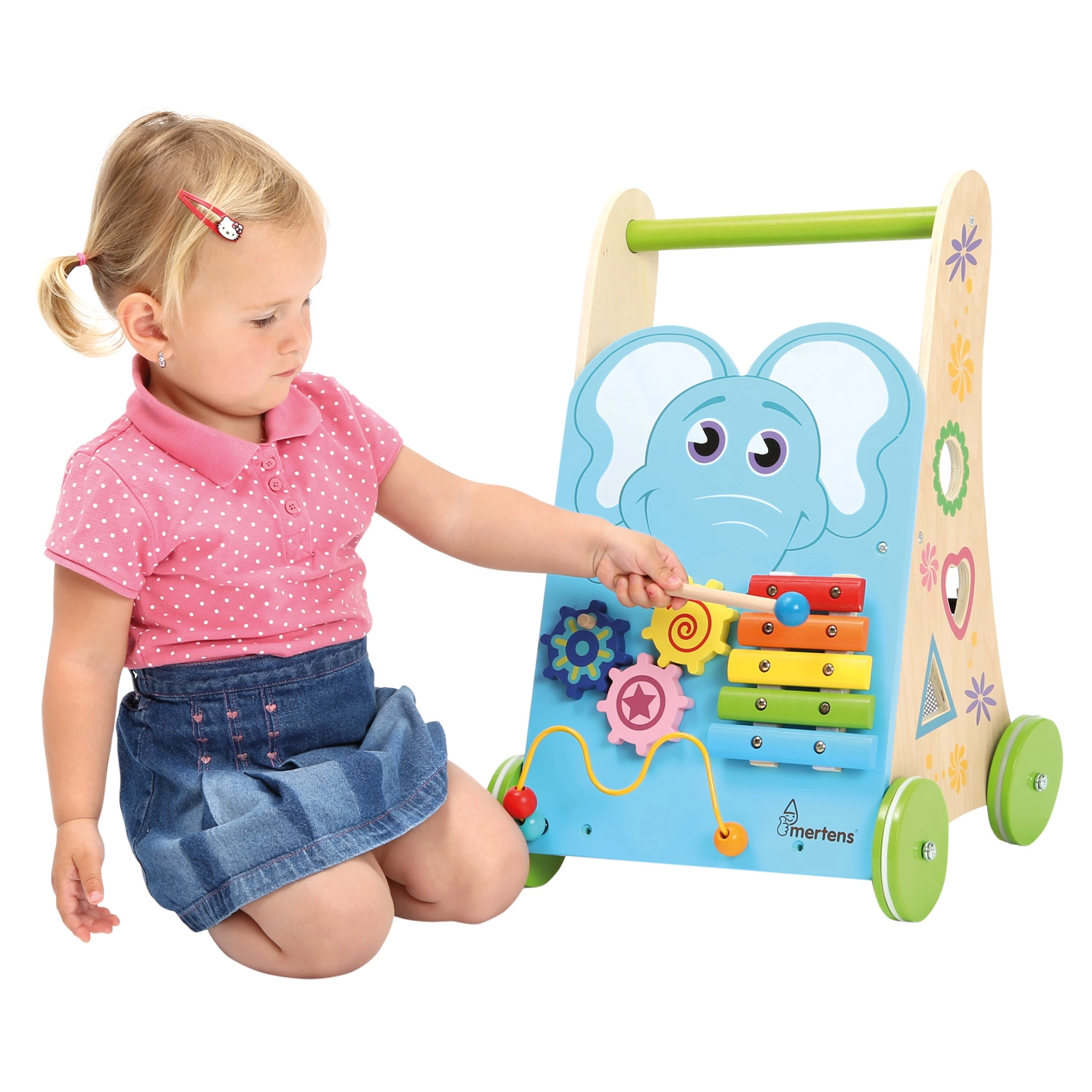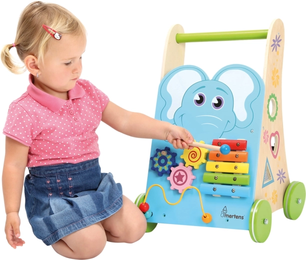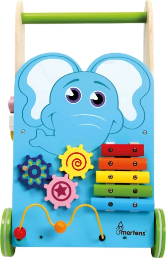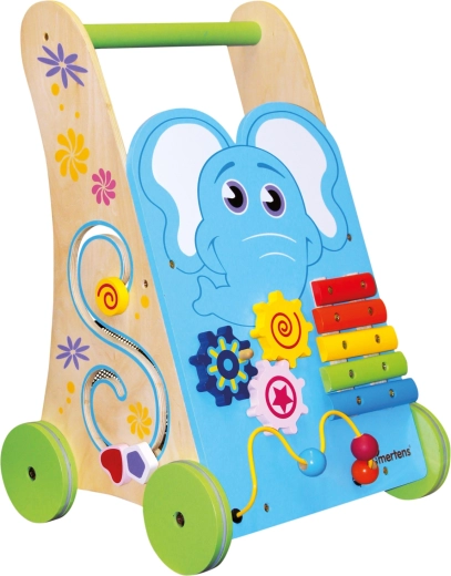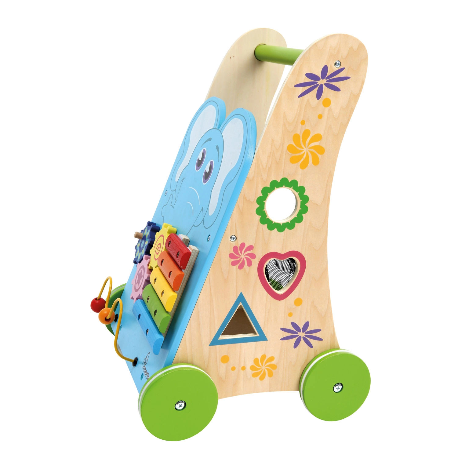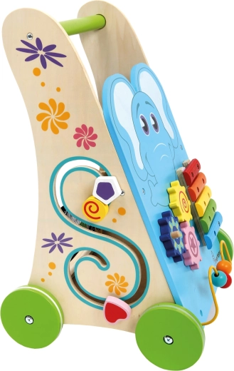 Questo girello multifunzionale in legno aiuta i bambini ad allenare equilibrio, coordinazione e motricità fine. Il pannello frontale è ricco di attività: xilofono musicale con bacchetta, ingranaggi, labirinto di perline e inseritore che favoriscono concentrazione e pensiero logico.
