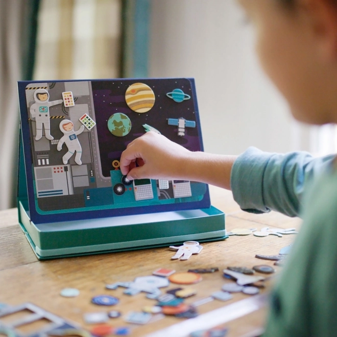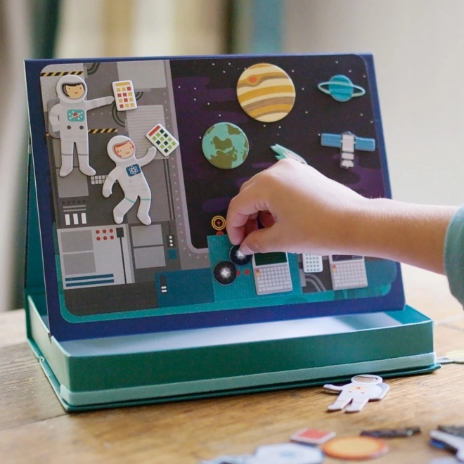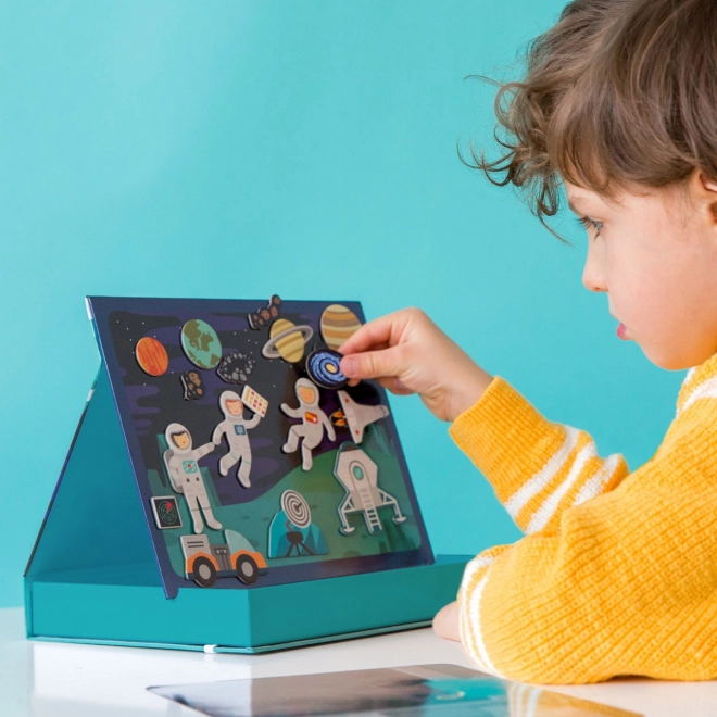 Il teatro magnetico Spazio offre ai bambini infinite possibilità di combinazioni e scene su due sfondi magnetici: nello spazio e sulla stazione spaziale. Con oltre 50 pezzi magnetici, i piccoli esploratori possono creare storie originali, sviluppare la fantasia e la motricità fine. La pratica scatola con supporto e fermagli consente di allestire la scena facilmente ovunque.