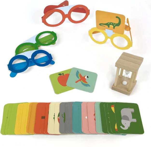 - 4 occhiali con supporto per carta, clessidra, 50 carte illustrate