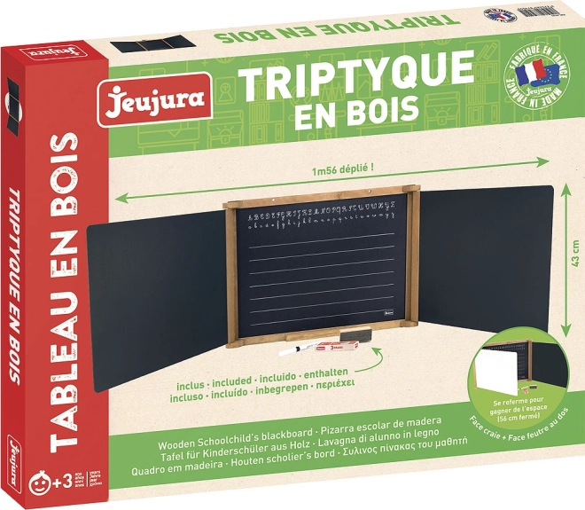 Elegante lavagna da parete a tre ante in legno massello che offre a bambini e adulti spazio per creatività e apprendimento. Combina una superficie nera per gessetti e una bianca per pennarelli, presenta un pannello centrale rigato con modelli di scrittura corsiva per un allenamento semplice, funzione magnetica e pratico ripiano. La confezione include gessetti, un pennarello e una spugna. Prodotto in Francia in faggio e pino di qualità con vernici e lacche a base d’acqua.