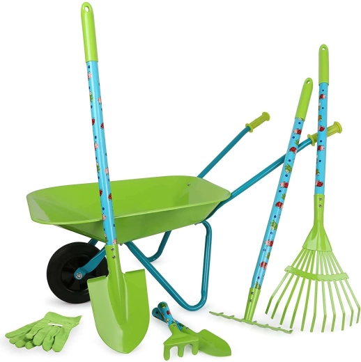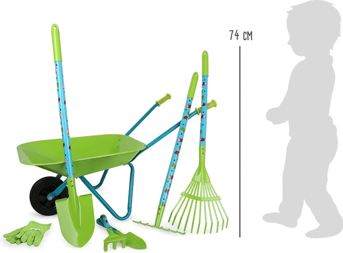 Questo grande set da giardinaggio per bambini SMALL FOOT offre tutto ciò di cui ha bisogno un piccolo giardiniere: carriola stabile, pala, rastrello, rastrello per foglie, piccolo rastrello, paletta e guanti protettivi. La maggior parte dei pezzi è in metallo, quindi sono robusti e durevoli, ma al tempo stesso leggeri e facili da maneggiare per le mani dei bambini.