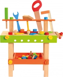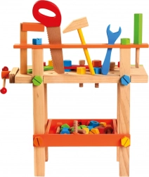 Questo banco da lavoro per bambini è ideale per i piccoli artigiani che amano avvitare, assemblare e riparare. Grazie alla struttura solida, al piano forato e alla pratica morsa, i bambini possono sperimentare situazioni reali e apprendere abilità di base mentre giocano.