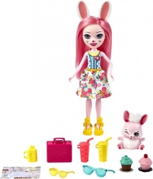 La bambola Bree con lunghi capelli rosa e orecchie di coniglio è pronta per il viaggio. Il suo outfit include un abito estivo con una stampa floreale, scarpe e occhiali da sole.