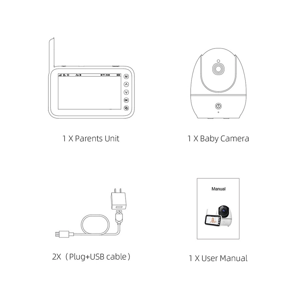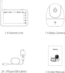 - Videocamera, unità genitore con display, alimentatore, cavo USB