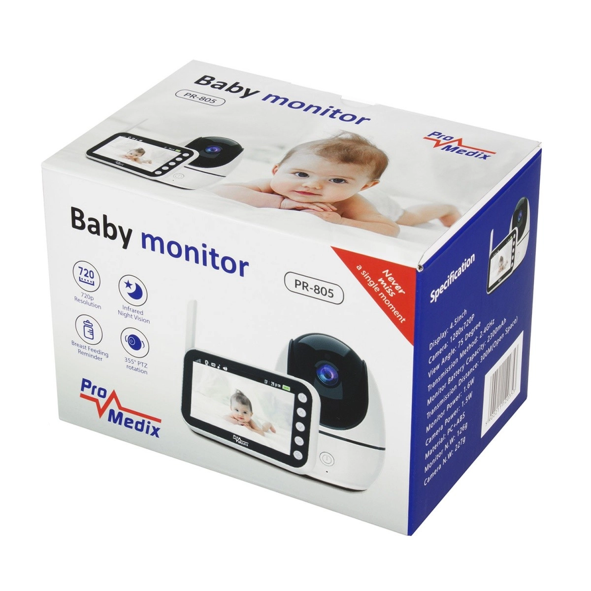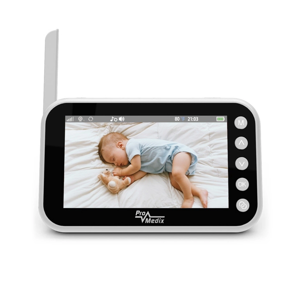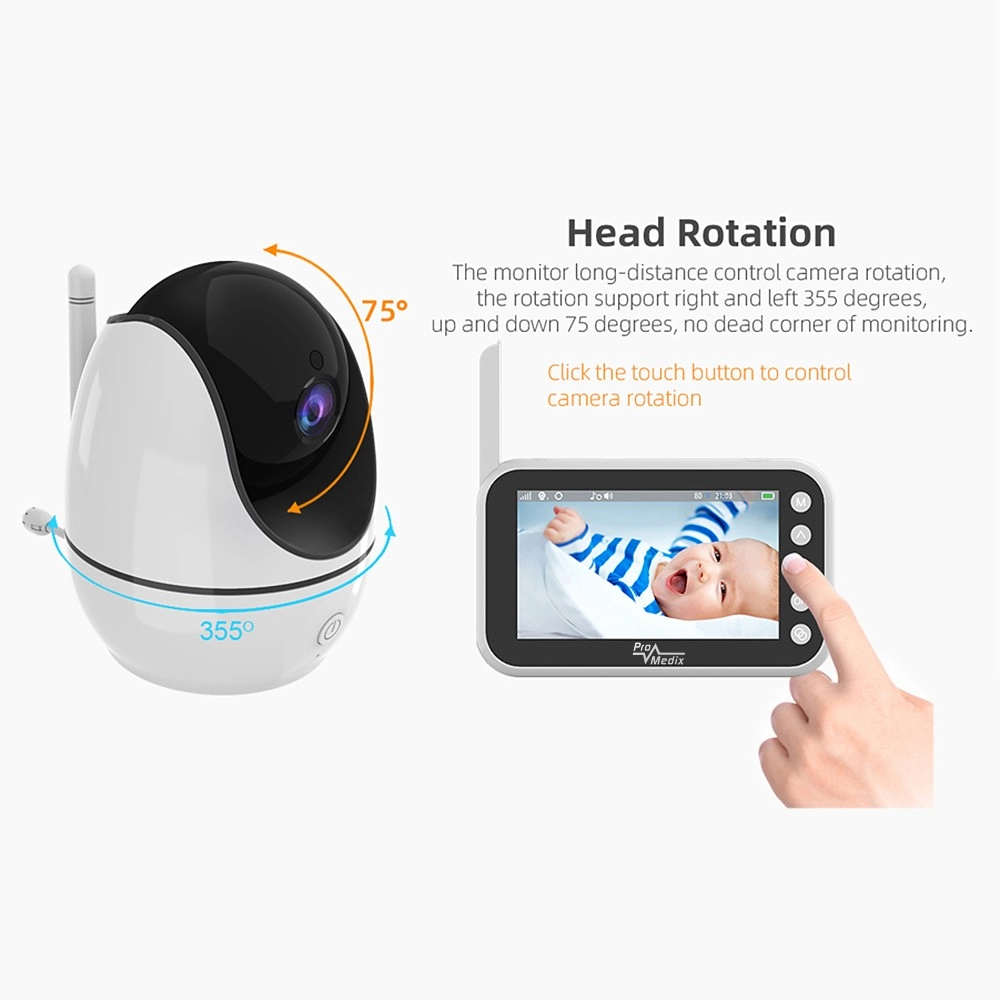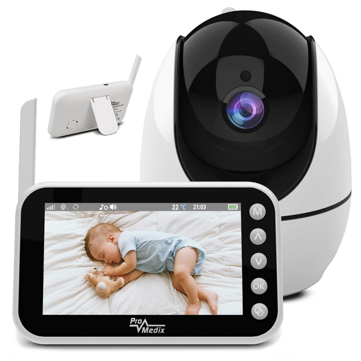 Il baby monitor PROMEDIX PR-805 offre ai genitori tranquillità grazie alla combinazione di immagine nitida a 720p, trasmissione audio affidabile e visione notturna. La videocamera compatta con testa rotante a 355° e il display portatile con antenna garantiscono un comodo controllo del bebè di giorno e di notte – in modo semplice, intuitivo e da qualsiasi punto della casa.