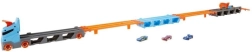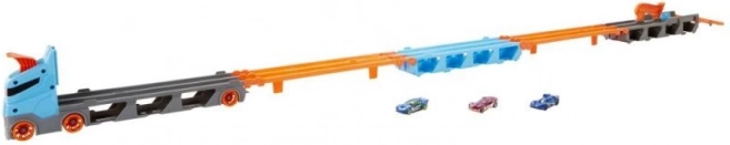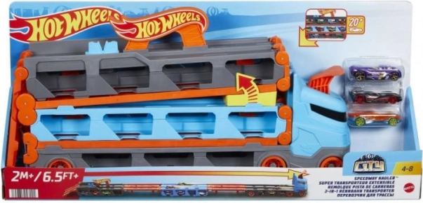 Con il trasportatore da gara 2-in-1 di Hot Wheels puoi facilmente riporre ed esporre fino a 20 macchinine grazie alle piccole finestre nel rimorchio. Quando è il momento di correre, il trasportatore, una volta aperto, si trasforma in una pista da 1,8 metri di lunghezza. I veicoli rimangono visibili sotto la pista e la cabina del camion si trasforma in un doppio lanciatore per due auto.