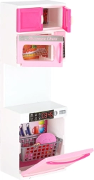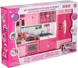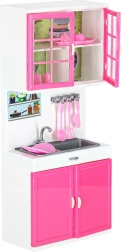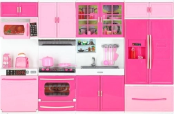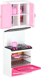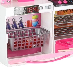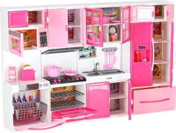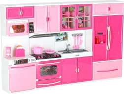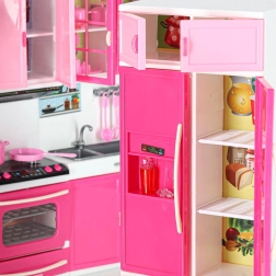 Elegante cucinina rosa e bianca per bambole composta da quattro moduli con illuminazione LED dei fornelli ed effetti sonori. Offre sportellini apribili, microonde, forno, lavastoviglie, frigorifero e lavello, oltre a ricchi accessori per un gioco di cucina realistico e per l’organizzazione della cucina.