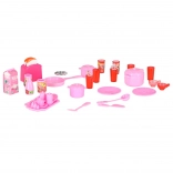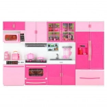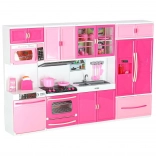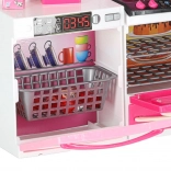 Il set include microonde e lavastoviglie, piano cottura con forno, vetrinetta con lavello e frigorifero con cassetto. I bambini potranno divertirsi con scenari completi di cottura, forno e pulizia.